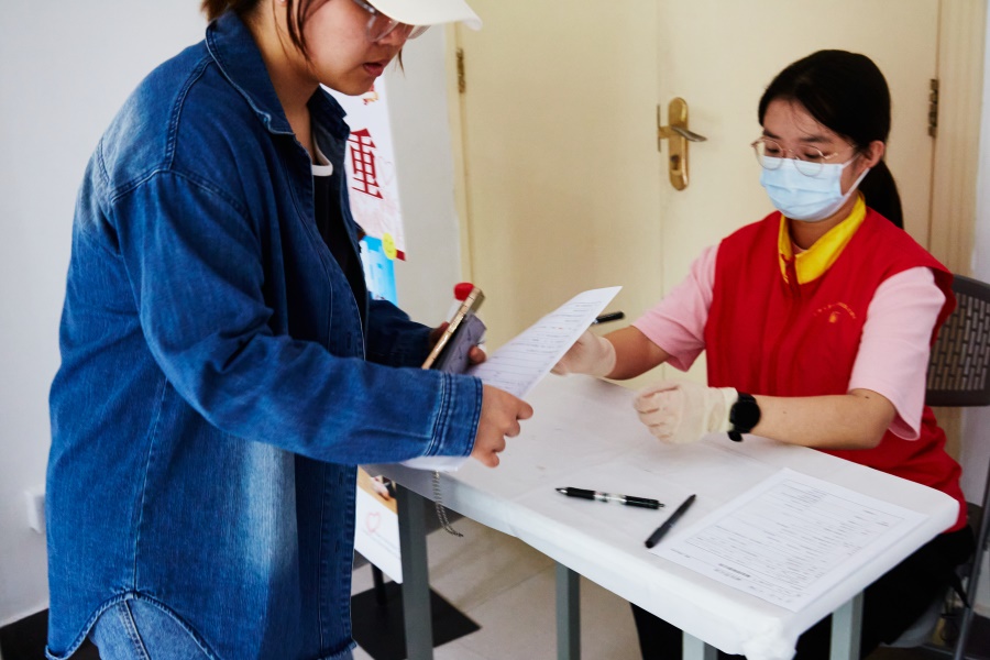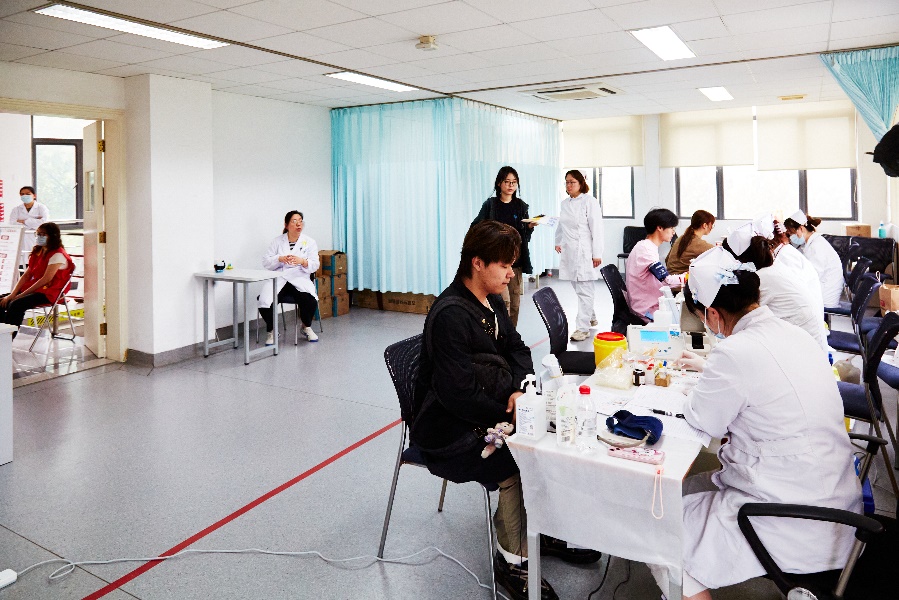 在二楼,医护人员进行献血登记表的审核,并询问同学身体的近况,包括献血经历、血型血压、既往病史等,确保每一位献血志愿者身体状况都符合条件。一系列检查完成后,同学即可前往四楼采血处等待采血。
