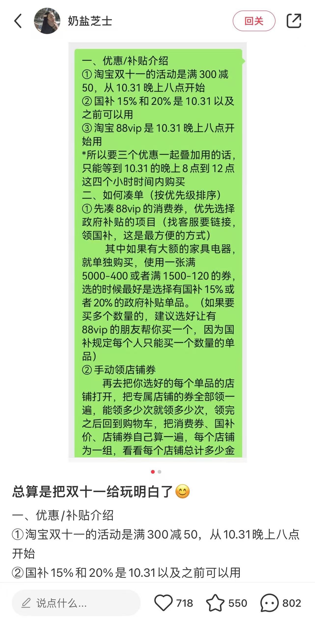 似乎只有深谙平台规则,才能在当下的“双十一”如鱼得水。金玉在凑单中体验到了乐趣。曾在游戏公司工作的金玉,出于职业习惯,对规则的敏锐度比较高。“一开始拿着这个东西的时候确实挺头大的,但经过研究和多次测试之后也能够很好地去运用它了。”凭借着对优惠工具的熟练掌握,金玉趁着本次双十一省下了一万六千多元的软装购买费用。金玉在小红书上展示双十一战果的一篇凑单攻略,截至11月14日,已收获718个点赞和802条评论。笔记发出之后,不少网友找金玉帮忙计算订单,更有人想让她直接登录自己的账号下单。“我不敢直接帮他买的。”金玉告诉记者,“不过能帮到别人还是蛮有成就感的。”
