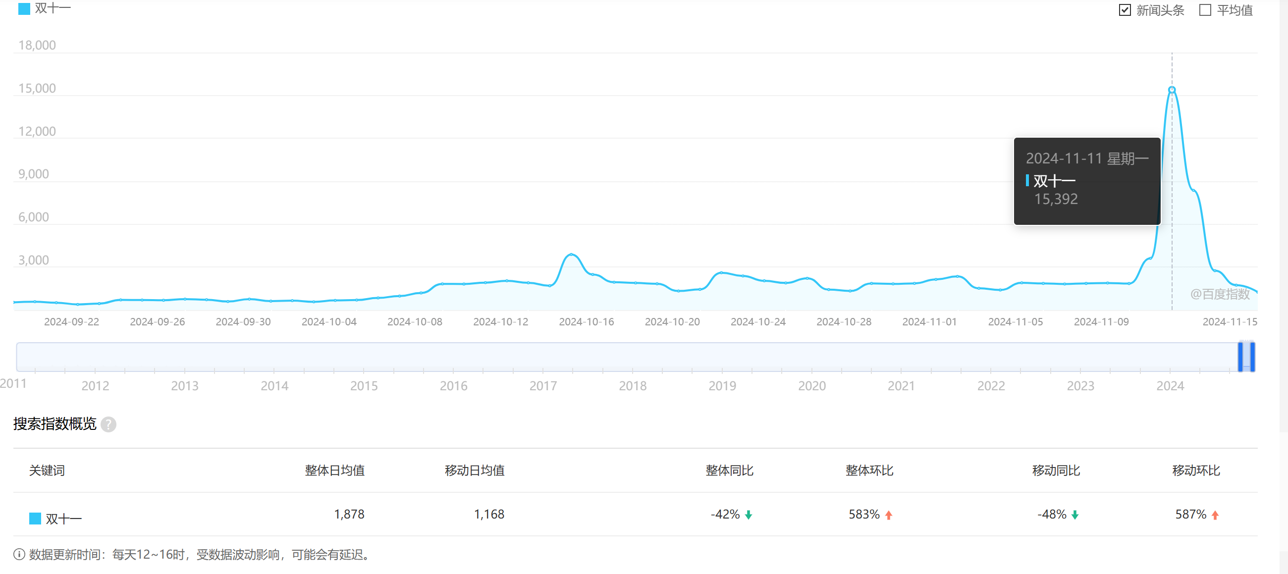 “购物狂欢节”似乎不再能让大家“狂欢”起来,社会对它的关注也越来越低。百度指数显示,“双十一”这一关键词的搜索指数在2024年最高为15392,不足2023年的一半。