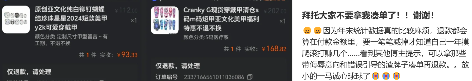 “凑单秒退货”带来的另一个问题是商家的经济利益损失。小邓所在的小红书平台,不论交易成功与否,商家每卖一单东西,会被抽取一定费用,例如运费险和出单费。“凑单的商品退款后我们自然没收入,但这笔费用是照扣不误的。”