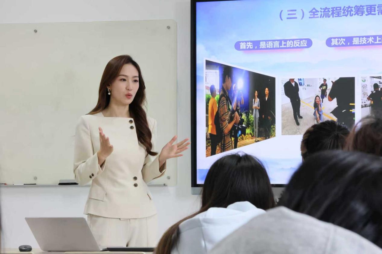 讲座中,郭凯旋老师以自身职业成长轨迹为脉络,生动讲述了从采编播全流程轮岗到主播台的实践历程,分享了在快节奏新闻现场、新闻播报及慢直播陪伴式表达中调整状态、适应工作的宝贵经验。她指出,主持人的成长不仅在于业务能力的提升,更在于心态的成熟与自我认知的建立——只有不断学习、主动拥抱变化,才能在全媒体时代的媒体变革中踏浪而行。