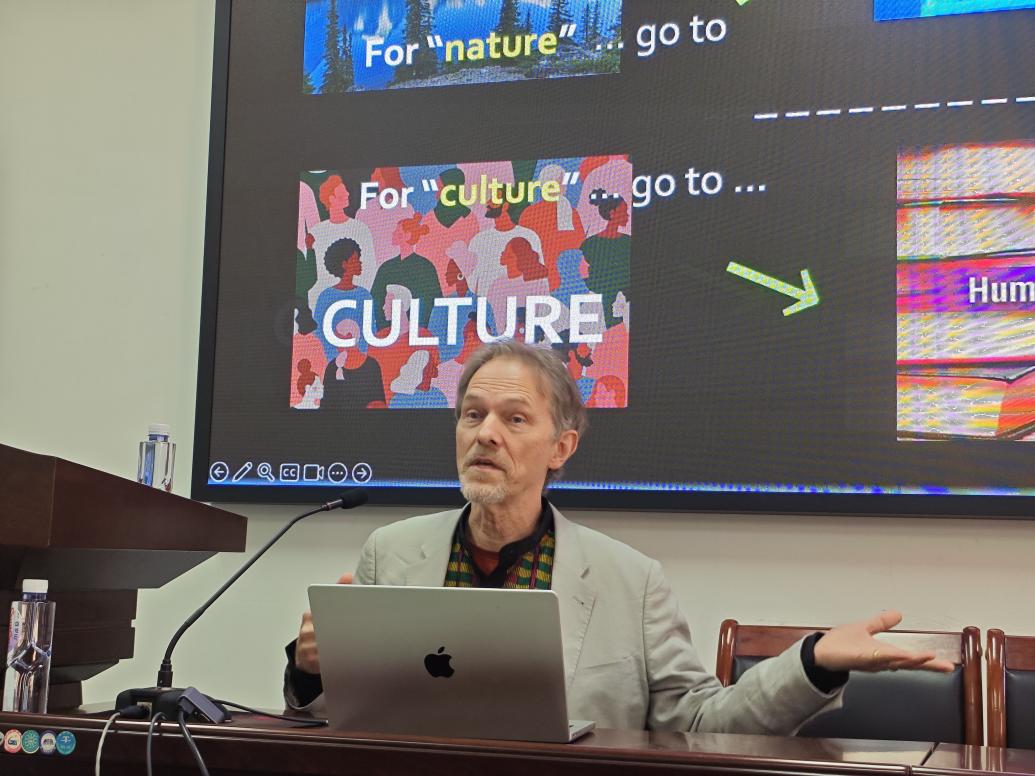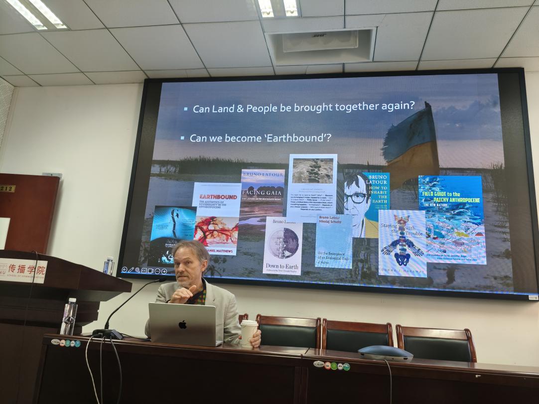 讲座中,Ivakhiv教授以菲利克斯·加塔利的“三重生态学”(自然-社会-精神)为理论起点,系统阐述了生态理念如何通过影像与媒介进行传播。他指出,在人类活动深刻重塑地球的“人类世”,传统的自然观念已不再适用,生态危机的本质是人类与地球关系的危机,也是我们想象未来能力的危机。要应对这一点,我们必须理解人类并非独立存在的个体,而是与土地、其他物种和地球系统“深度纠缠、相互依存”的存在。