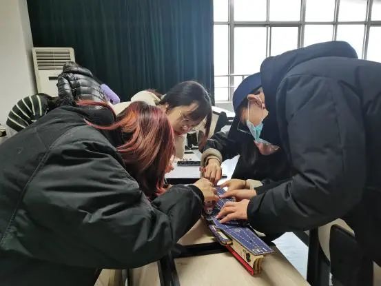 我们组的制作过程异常艰难,一开始没有图,没有锤子,没有视频,有的只是我们四个粗人。像极了我们共产党的奋斗史。但是本组成员在长征精神的感召之下,一心满怀毛主席,将丝线想象成琴弦,把锤子敲击的声音在耳中化作优美的奏鸣曲,终于,这幅凝聚心血的作品顺利完成了。