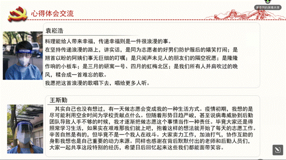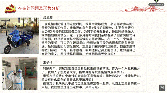 之后,来自两个支部的三名党员志愿者代表分享抗“疫”经历。
