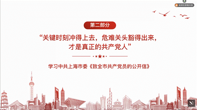 接着,第二支部周雨洁、张美茹、龙文萱、张啸男、余华勇五位播音专业党员同志发挥专业所长,带领与会成员朗诵学习了中共上海市委《致全市共产党员的公开信》。五位党员同志铿锵有力的声音振奋人心,正如公开信中指出,党员同志要亮身份、见行动;要披坚执锐、攻坚克难;要深入基层、深入群众;要发出好声音、传播正能量。