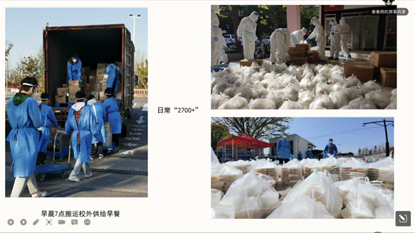 2021级研究生第一党支部的唐春明同志,在校园封控管理期间多次参与三餐运送、物资发放等志愿工作,目前正在江苏盐城进行隔离。他通过讲解志愿活动过程、具体实践内容与心得感悟交流三部分内容,用一段段真诚的文字和一张张图片用心诉说了和其他几位志愿者一起并肩作战的故事,让与会成员看到了身为党员的担当与责任,用行动兑现着“我是党员我先上”的铿锵誓言。