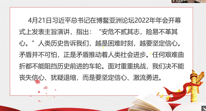 学院党委专职组织员、2021级研究生第二党支部书记王正梁同志向与会党员分享他的社区防疫经历:主动亮明党员身份,第一时间参加所在社区的防疫工作,积极落实“双报到”要求,与社区干部群众并肩作战,在志愿服务中当先锋、作表率。并用4月21日习近平总书记在博鳌亚洲论坛2022年年会开幕式上发表的主旨演讲:“人类历史告诉我们,越是困难时刻,越要坚定信心。矛盾并不可怕,正是矛盾推动着人类社会进步。任何艰难曲折都不能阻挡历史前进的车轮。面对重重挑战,我们决不能丧失信心,犹疑退缩,而是要坚定信心,激流勇进。”来与大家共勉。
