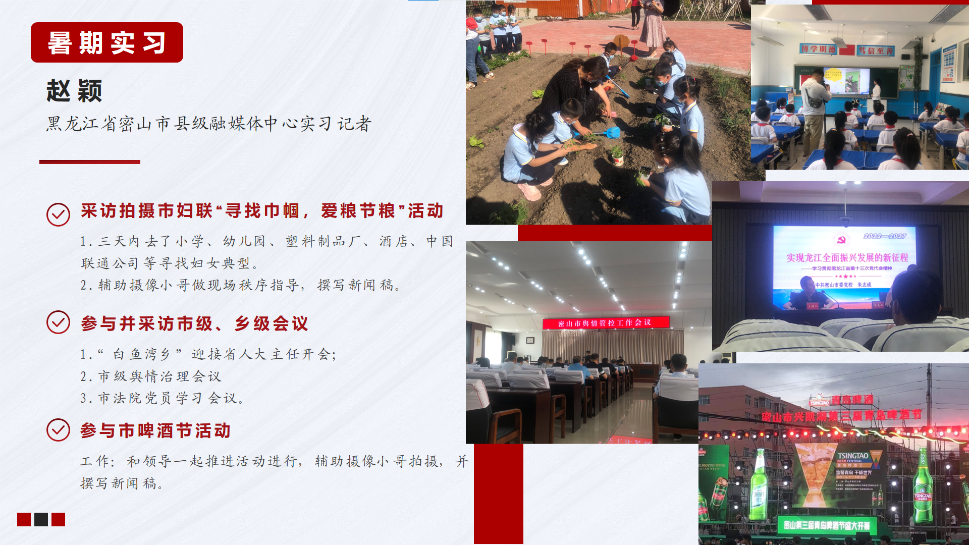 赵颖同志分享了暑期自己在家乡县级融媒体中心实习的经历。作为一名实习记者,她每日跟随单位同事出入各大会议和活动现场,用镜头和文字记录典型人物故事,传播社会正能量,并在采访活动中对政府运作模式有了一定了解。她表示,历经此次实习工作后受益匪浅,望今后自身可以加倍努力,用专业所长在岗位上发光发热。