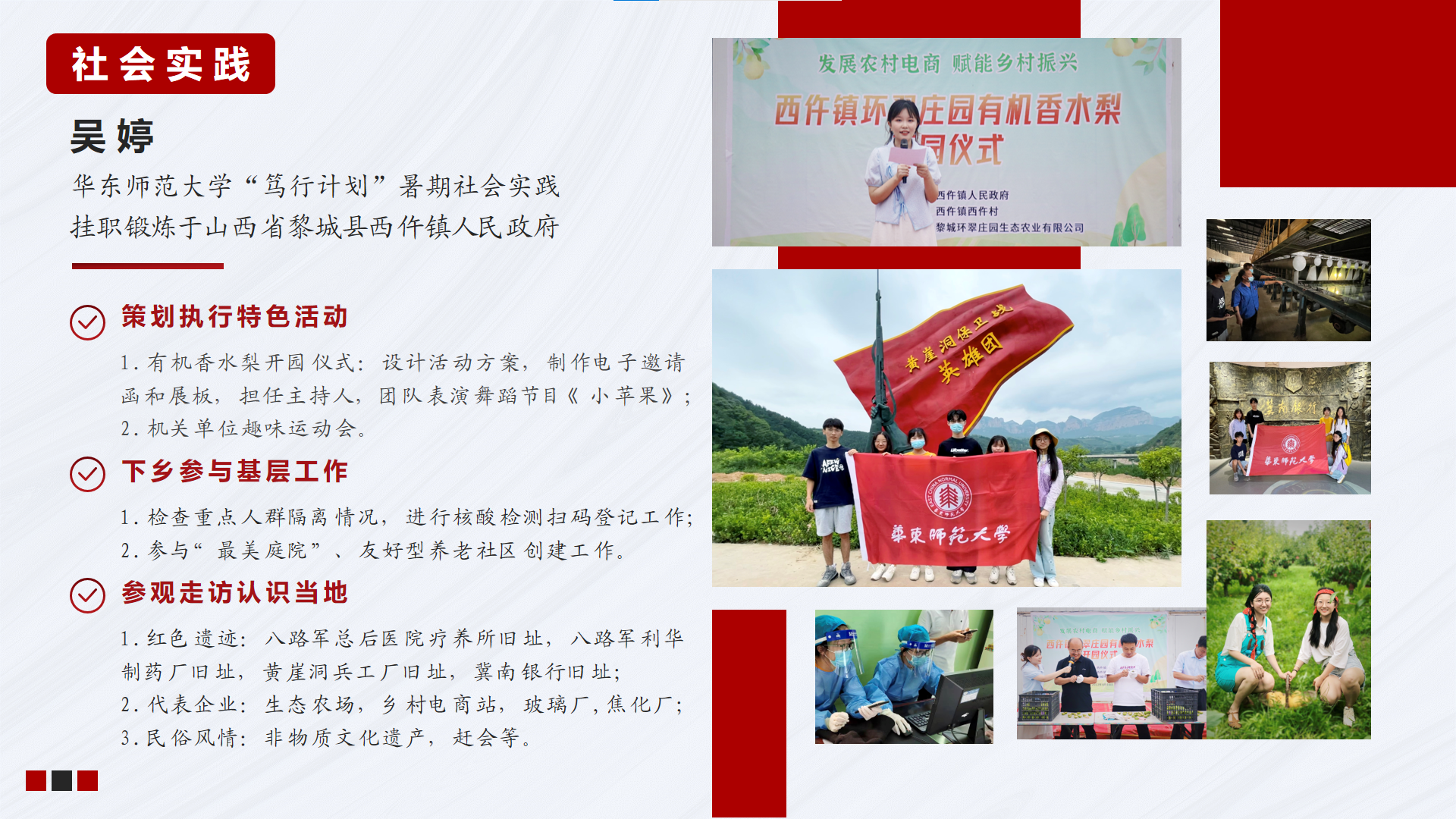 吴婷同志则参与了香香漫画 “阡陌笃行计划”暑期社会实践活动,前往山西省黎城县西仵镇人民政府进行三周挂职锻炼。她带领实践团队为当地特色农产品策划与执行开园仪式,以精彩纷呈的活动现场助力乡村振兴。此外,下乡服务基层,日常核酸检测,走访红色遗迹与代表企业亦是其丰富的工作内容。
