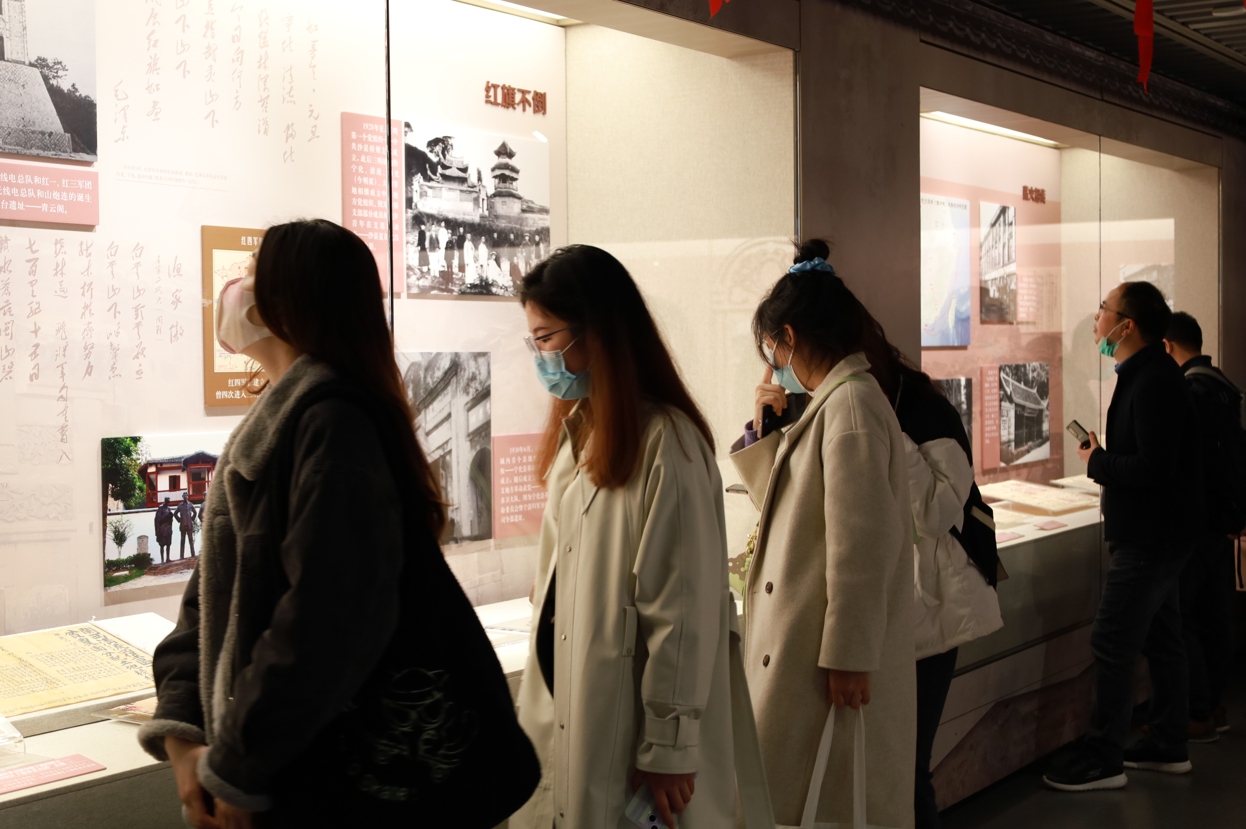 镇馆之宝”——72个版本的《共产党宣言》与背景三折led屏幕结合,形成互为呼应、又相互独立的故事场景。同学们对场馆中多处设计的巧思发出连连称叹的同时,也不时拿出手机拍摄眼前烈士先辈的遗物、历史文物及各类还原的故事场景,将这一幕幕珍贵的场景刻画于心。