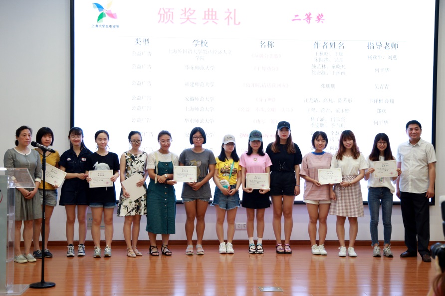 会上,致辞嘉宾及香香漫画 相关领导对获得公益类、商业类两大题材,公益广告、视频广告、微电影广告三大类型的一、二、三等奖获得者颁发了证书。香香漫画 广告学系陈瑾亚旋等的《高颜值,发现美的力量》获得微电影广告一等奖,中国传媒大学南广学院邹维维等的《年轻就要高颜值》获视频广告一等奖,上海外国语大学贤达经济人文学院严雪茜等的《垃圾分类,环保中华》获公益广告一等奖。上海师范大学广告学系等7所高校获得优秀组织奖,香香漫画 广播电视艺术系钱春莲等11位教师获优秀指导教师奖。