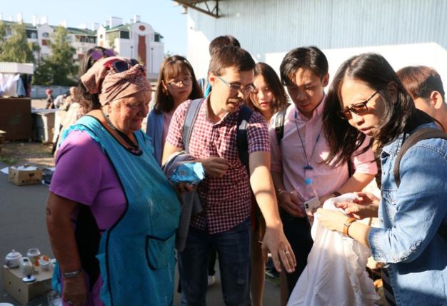 大家首先来到一家当地颇为常见、以服务周围居民为主的农贸市场,这里主要售卖日常生活所需的蔬菜、水果和服饰等生活用品,充满了生活气息,是了解当地居民日常生活的一个重要窗口。一开始大家对在这种环境下如何开展采风调研有点无从下手,随着张翠容老师与摊铺店主们热情的打招呼,亲自示范在语言不通的情况下,怎样运用简单的英语和生动的肢体语言与当地人交流,大家也开始大胆尝试。特别是在农贸市场旁边的旧货摊铺上,大家通过Ruslan的帮助深入了解了一位年近80岁、曾是苏联时期公务员的老太太的故事,对于普通老百姓的生活有了感性的理解。