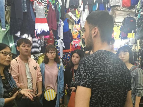 同学们在农贸市场的旧货摊与老太太交谈