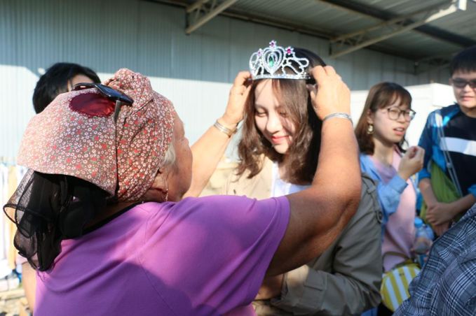 老太太为同学戴上皇冠作为礼物