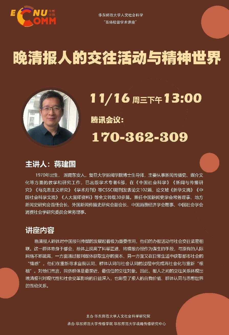 蒋建国,1970年出生, 湖南东安人,复旦大学新闻学院博士生导师,主要从事新闻传播史、媒介文化等方面的教学和研究工作,已出版学术专著6部,在《中国社会科学》《新闻与传播研究》《马克思主义研究》《学术月刊》等CSSCI期刊发表论文102篇,论文被《新华文摘》《中国社会科学文摘》《人大复印资料》等全文转载30多篇。兼任中国新闻史学会常务理事、地方新闻史研究会首任会长、外国新闻传播史研究会副会长、中国消费经济学会理事、中国社会学会消费社会学研究委员会常务理事。
