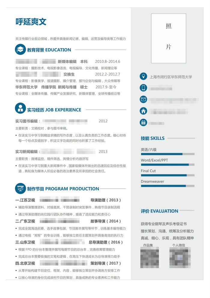 经过激烈角逐,来自2017级新闻与传播专业的呼延爽文同学荣获本次比赛一等奖,李从容、蒲璐同学荣获二等奖,张硕衍、胡鑫和韩蓉同学荣获三等奖。呼延爽文同学创新性地在简历中添加“二维码”展示个人作品集,从而摘得本次比赛“最佳创意奖”。