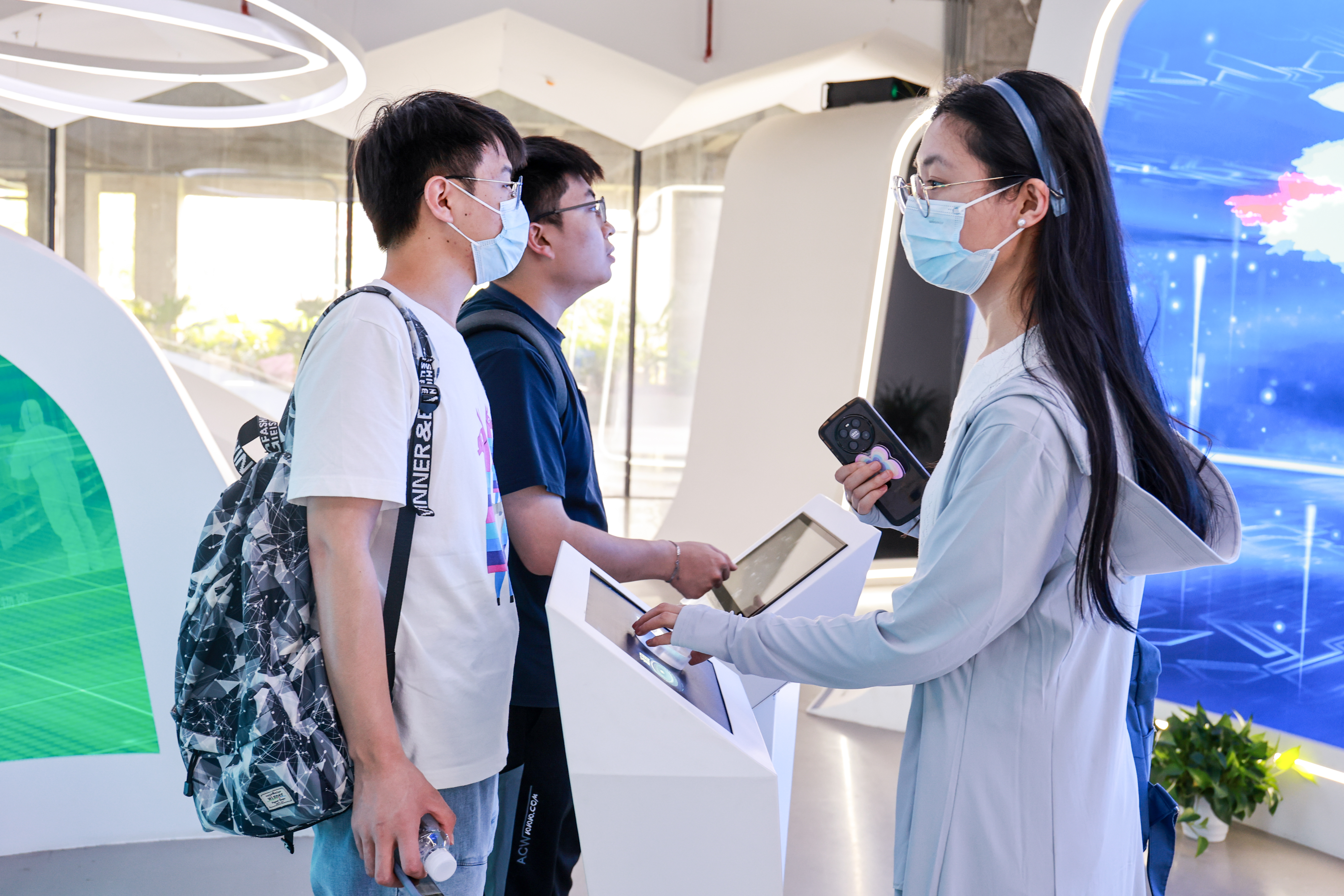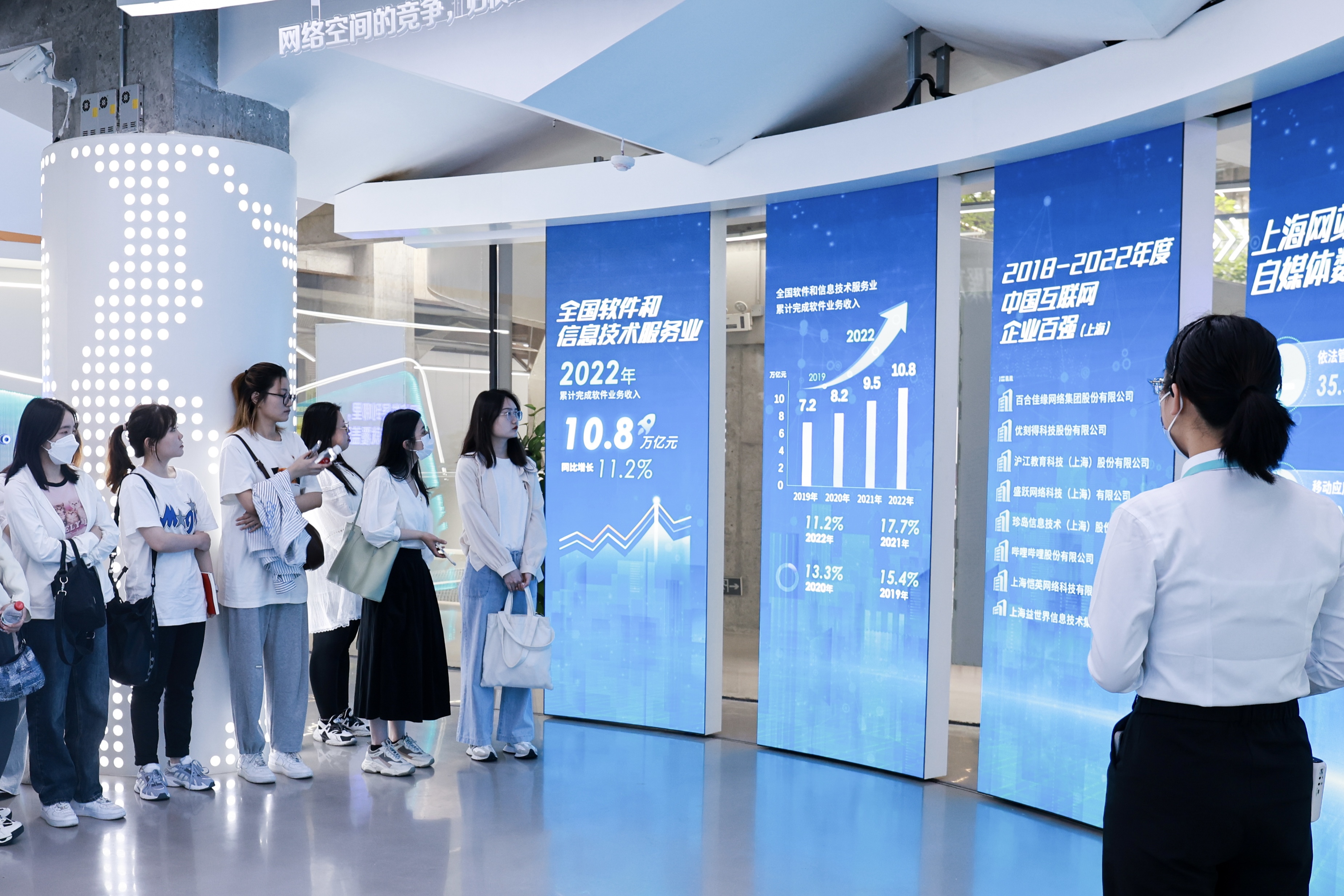 习近平总书记明确指出:“网络发展到哪里,党的工作就覆盖到哪里。”一路向前,支部党员走进了“绿之丘”观景平台建筑的二楼——新时代上海互联网企业党建创新实践基地。在“风气浦江”、“网聚力量”、“破浪前行”三个展厅中,党员们通过影音投屏、屏幕互动等方式近距离了解新时代互联网的发展情况、上海互联网企业的前景及其党建工作历程,并在“E友汇”、“E书屋”、“E企秀”等展厅中体验了B站、美团、爱回收等企业用互联网技术赋能百姓生活的创新实践,进一步了解其特色党建做法,感受到互联网党建发展的上海智慧和决心。