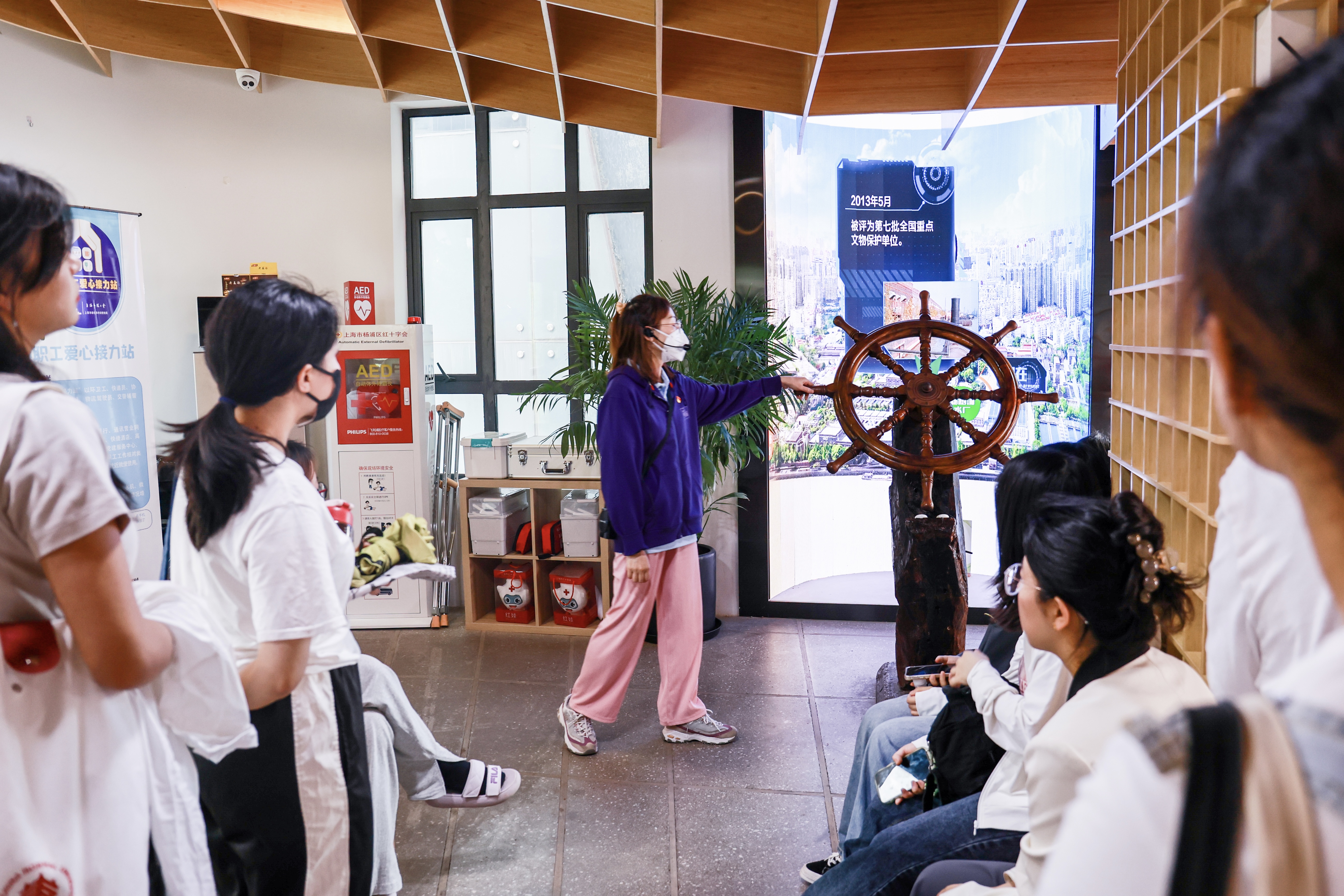 讲解员带领支部党员参观了位于秦皇岛路码头二层的党群服务站。通过滨江VR全景的多媒体互动手段,党员们深切体会到百年杨浦滨江从开埠到成为改革开放发展前沿,再到党的十八大以来发展成为“人民水岸”的巨变,从昔日“工业锈带”到如今“生活秀带”的更新再造。