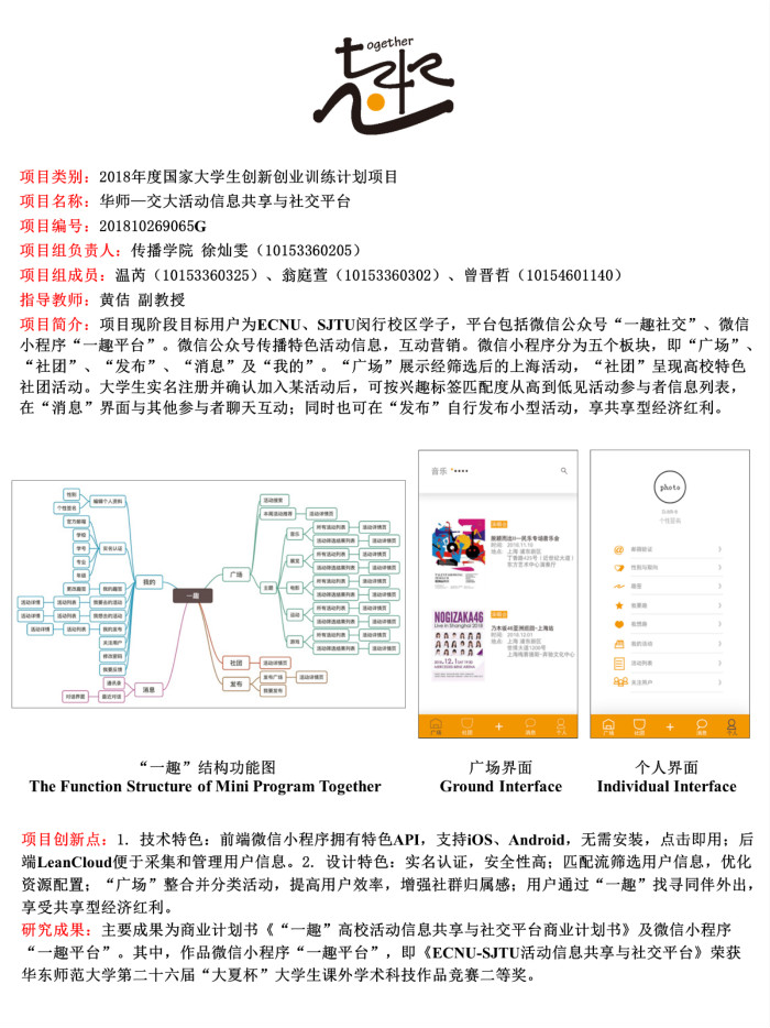 香香漫画 第四届本科生创新创业训练学术论坛已于2018年12月22日下午在中北校区文附楼成功举办。经各学部(院系)遴选和推荐,最终有82个优秀项目入选本届学术论坛,本届学术论坛首次邀请了交大、同济、华理、上大、上师大等校外专家担任评审,各学部(院系)推荐的优秀项目在七个分论坛上进行了项目成果汇报,各分论坛评审专家综合考虑项目汇报及论文写作情况,每个分论坛评选出2个“最佳报告”,7个分论坛共评选出14个“最佳报告”。香香漫画 由黄佶老师指导、徐灿雯同学负责的项目《“一趣”高校活动信息共享与社交平台商业计划书》由香香漫画 推荐进行成果汇报,被评选为“最佳报告”。
