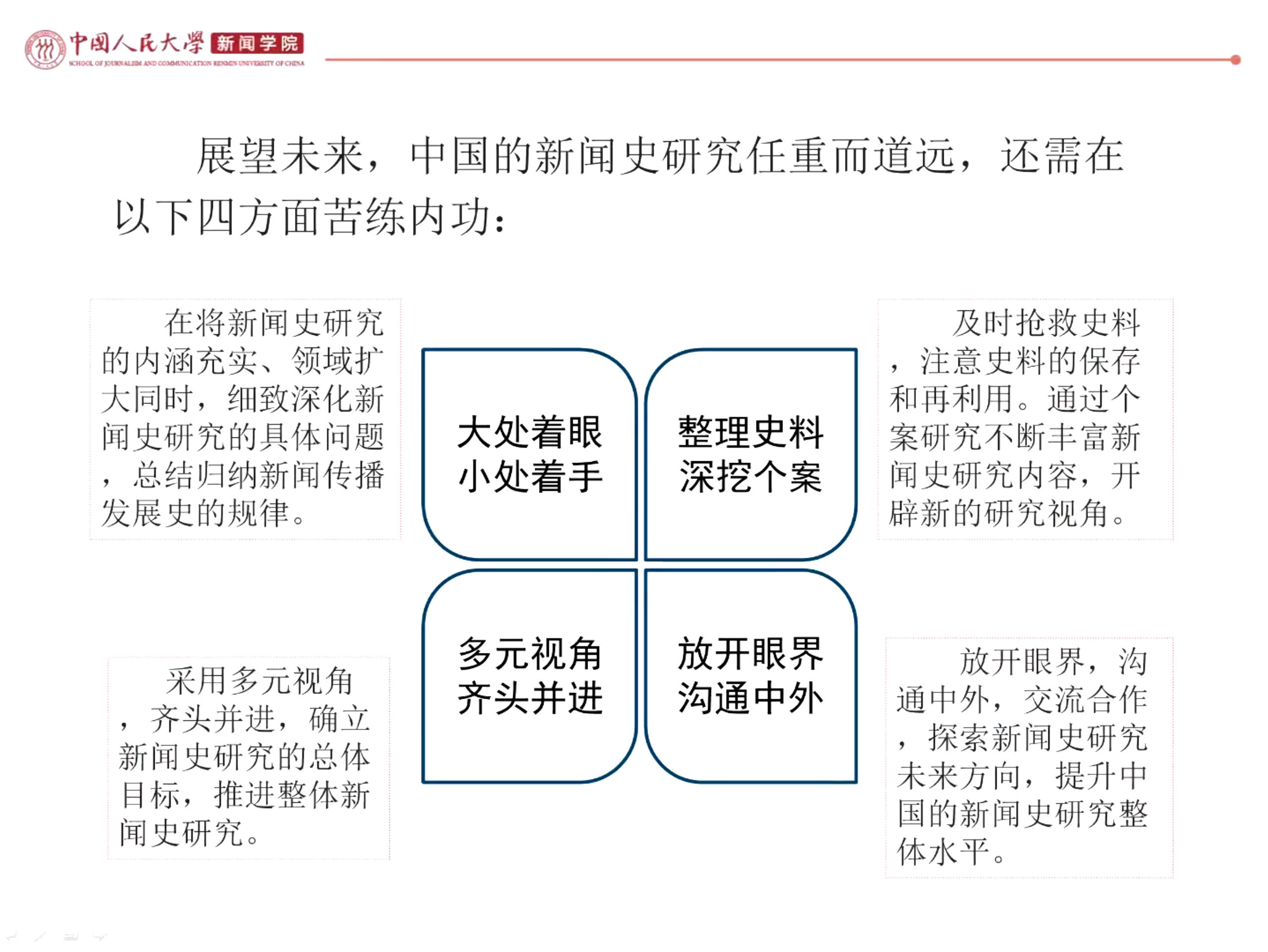 最后,邓绍根立足当下,展望未来。他提出中国新闻史研究任重而道远,未来的中国新闻史研究需要着眼于以下四个方面:一,大处着眼,小处着手;二,整理史料,深挖个案;三,多元视角,齐头并进;四,放开眼界,沟通内外。他坚信,在研究者不懈地深耕细作下,中国新闻史研究的精品佳作将不断涌现,一个更加绚烂多彩的未来终将到来。