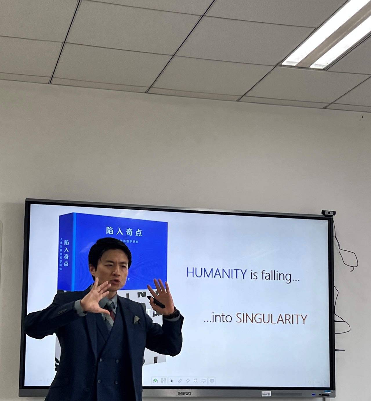 分享结束以后,甘莅豪教授作总结发言。“我们刚进来认为外面很吵,我们希望有媒介,随着逐渐沉浸在吴冠军老师的讲座中,便听不到这种声音了。媒介可以是阻碍,或者说沟通/透明本身就是阻碍。就像刚刚吴老师所提到的所有的现实可能是被创造出来的,我们在这个世界里不用追究其本体是什么,不是去看破这个世界,而是要去享受这个世界。随着媒介不断更迭,我们沉浸其中,这样一个奇点的时刻正式我们需要去思考的一个时刻。”随后,现场学生业与吴冠军老师进行积极互动,发言提问。