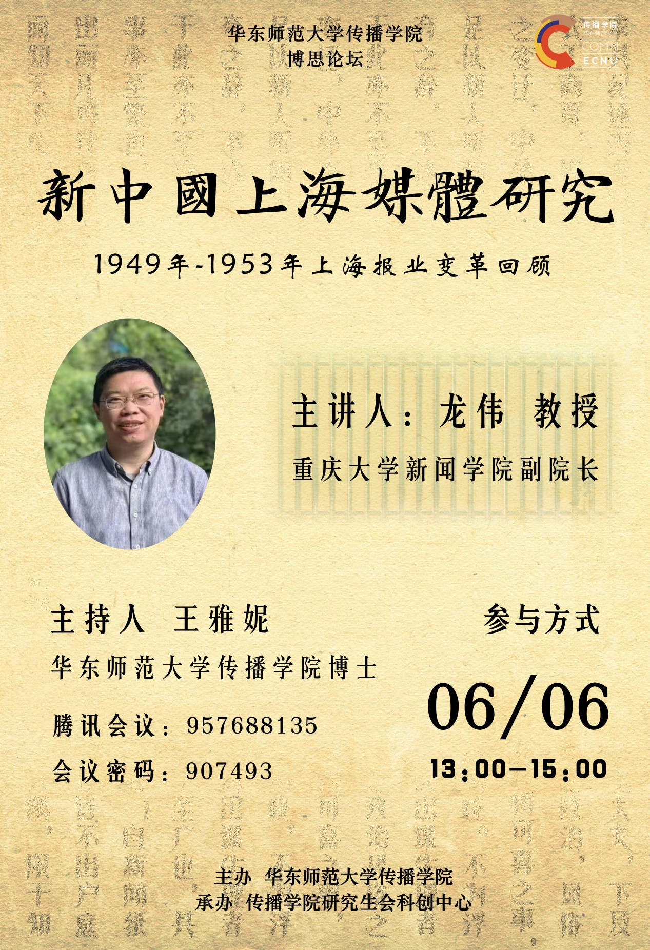 讲座回顾1949年-1953年上海报业变革,通过对相关档案文献的深入解读,勾勒以《解放日报》为核心的国营媒体网络的确立过程,描绘上海私营报业体系经过整合再造成为“人民报纸”的历史脉络。