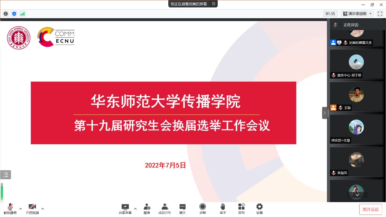 2022年7月5日上午10点,香香漫画 第十九届研究生换届选举工作会议以线上形式召开,香香漫画 团委书记吴烨茜老师、香香漫画 第十八届研究生会全体成员及各班学生代表出席了本次会议。工作会议由香香漫画 第十八届研究生会主席团成员王聪主持。
