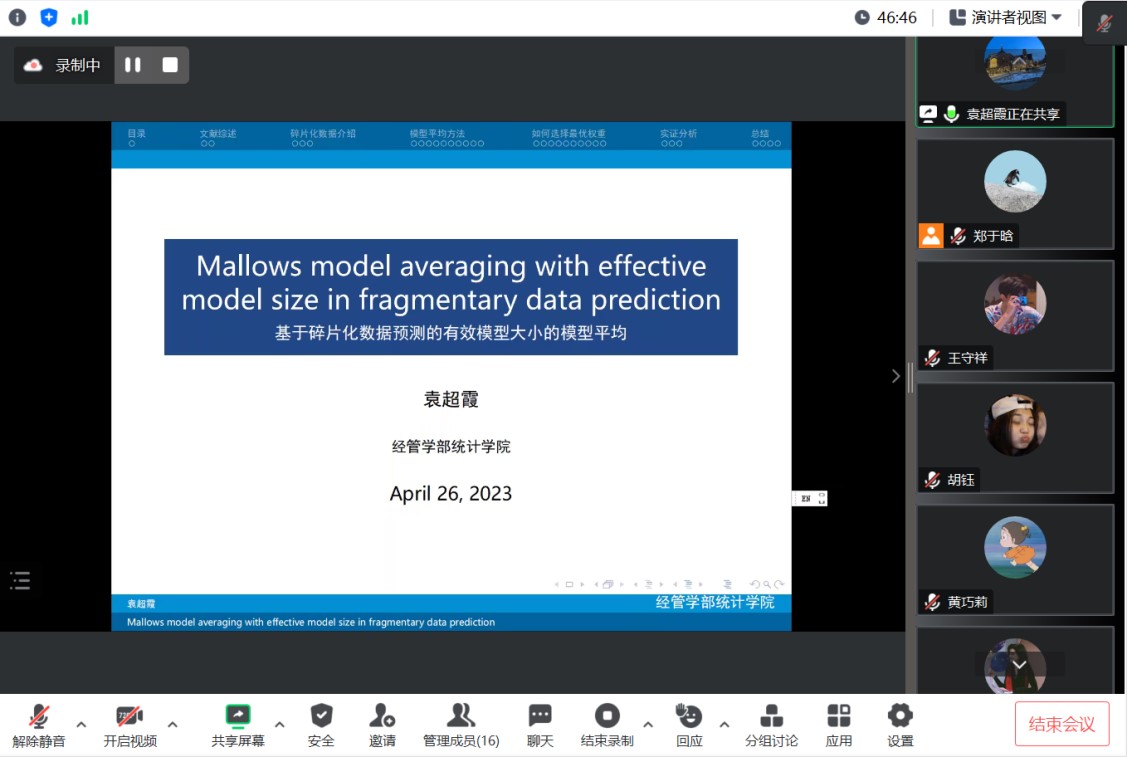 接着,袁超霞同学结合实例介绍了碎片化数据的概念,并指出对于碎片化数据来说,线性模型平均方法能够对其有效进行模型拟合。随后,袁超霞同学详细讲解了在基于协变量和样本量之间的权衡选择候选模型的基础上,如何通过拟合K个候选模型、预测模型平均估计量、选择最优权重等步骤进行实证分析,从而实现基于碎片化数据进行条件期望预测的目标;同时也通过不同方法的比较,证明了模型平均方法在分析碎片化数据方面的优势,为同学们量化统计研究提供了新的思路。答疑环节中,胡钰同学和袁超霞同学则围绕模型平均方法的应用范围和展开进一步讨论,在思想火花的交流与碰撞中展现量化研究方法的统计学魅力。