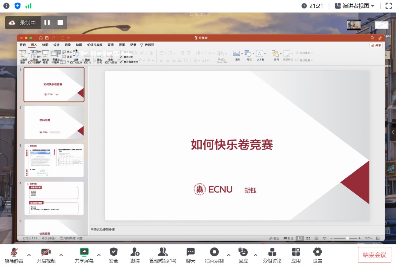 “快乐”是胡钰同学分享过程中频频提起的关键词。她认为,选择合适的队友是快乐竞赛的决定性因素。目标一致、分工明确的团队能够凝聚在一起共同努力;其次,在竞赛过程中,不能一味畏惧“冲突”,要敢于为优化方案提出自己的观点,让共识在团队磨合中逐渐成型;同时,胡钰同学也鼓励大家在竞赛过程中保持乐观自信的心态,脚踏实地、坚持不懈,;最后,胡钰同学强调,竞赛并非以结果为唯一导向,期间有颇多因素影响。享受过程、顺其自然,在自己能力范围内发挥到最好,也能够在竞赛过程中收获快乐。