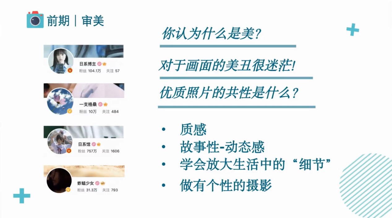 上半场分享由余成同学围绕“人像摄影技法”展开。她将人像拍摄的内容分为前期和后期两个环节,认为在拍摄前期环节中,首先要注意的是审美——优质照片不仅要具有质感,而且要具有故事性和动态感,好的审美是好的人像作品的基础。同时还要学会放大生活中的细节,发现美好瞬间;其次是摄影工具的使用。余成同学细致讲解了她在摄影器材的选择和使用方面的经验。她认为在日常人像摄影中,要掌握照片正确曝光的方法,同时要学会摄影器材前期的设置。而在拍摄构思部分,余成同学介绍了拍摄人像作品时“服化道”和场地应当如何选择,并强调了对光影的捕捉和构图的巧思在摄影中的重要性。