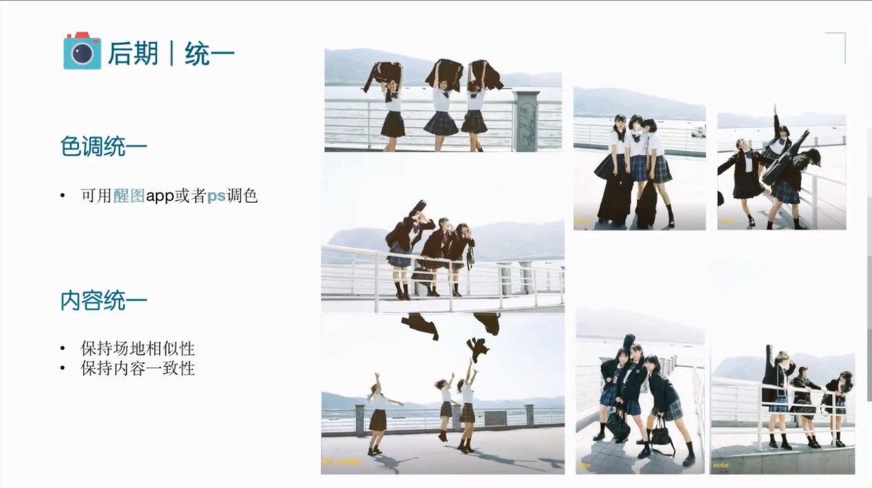 拍摄后期环节中,余成同学则着重讲解了照片的处理。余成同学认为后期处理照片的关键是要“统一”,包括色调的统一和内容的统一,并在讲解过程中推荐了拼图调色的工具,鼓励对摄影感兴趣的同学进行特定风格的调色学习。同时,余成同学也建议大家在拍摄时做到主题内容的一致,以保证照片拼接后更加具有故事性。
