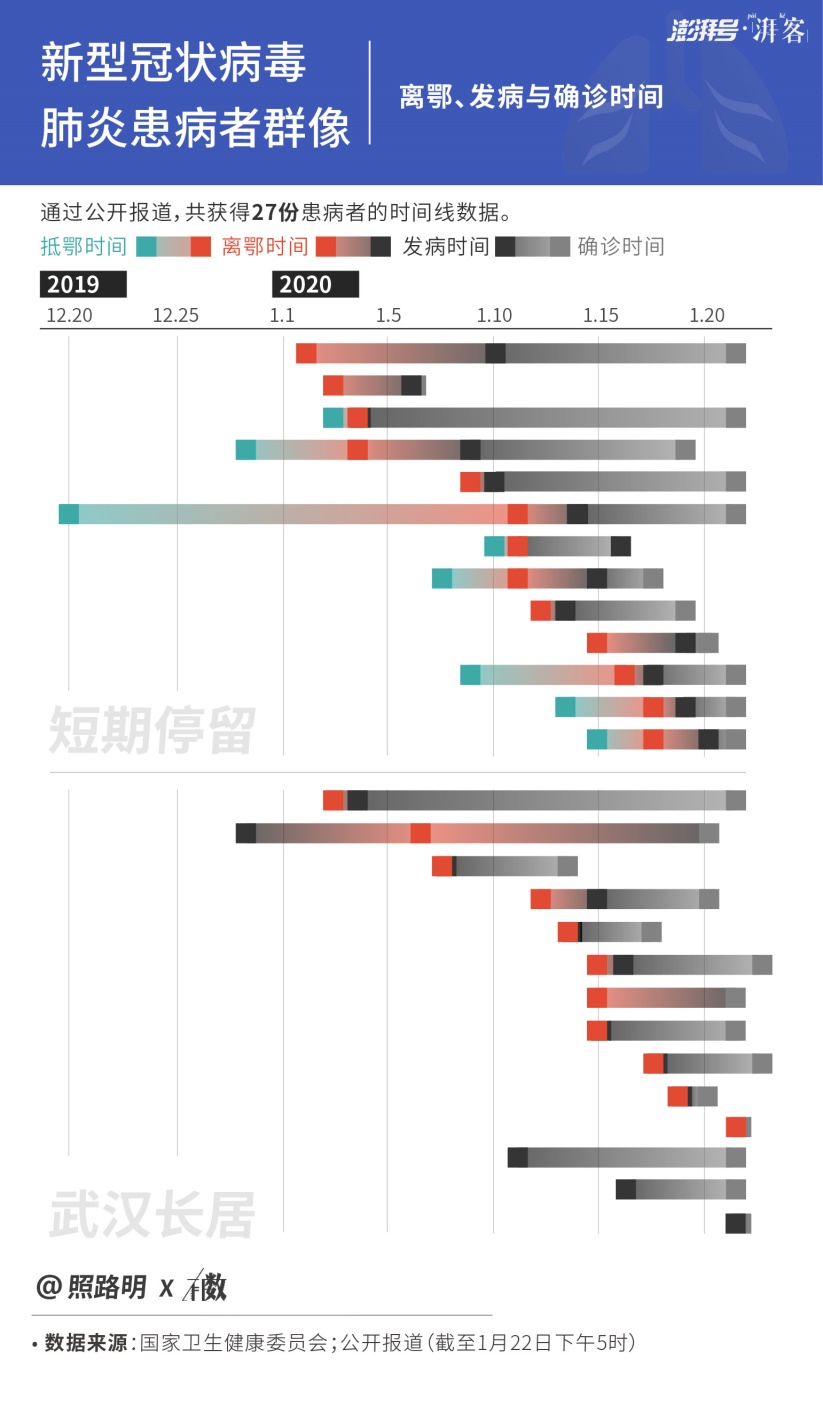 疫情肆虐伊始,本着作为新闻人的新闻敏感,赵鹿鸣于1月22日开始收集并分析当时的病例数据,尝试进行编码处理并获得一些基本结论。从早上10点着手收集数据到晚上19点交稿,赵鹿鸣仅仅用了9个小时的时间。1月23日,赵鹿鸣以澎湃号入驻名字“照路明”为名,在澎湃新闻湃客·有数栏目上发表《新型冠状病毒肺炎病例群像:何时发病,多大年龄,在哪分布?》一文,通过分析年龄、性别、在武汉停留时间、出现症状的时间、确诊时间等数据,尽可能展现了一个相对全面的新型肺炎患病者群像。