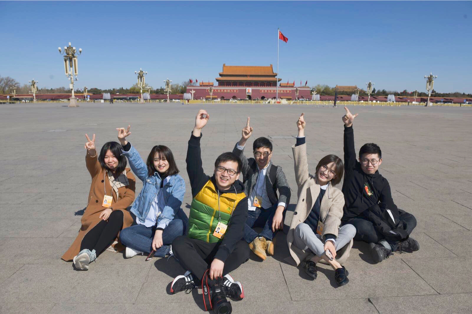 沈杰群(左一)与同事们报道两会
