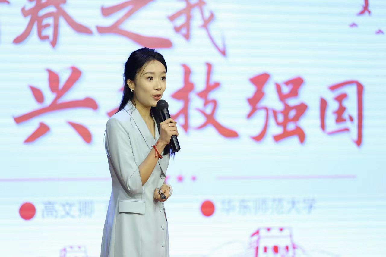 高文卿、李心悦以《以青春之我,兴科技强国》为题,以“大零号湾”为切入点,从上海张江科学城的建设,遵义市板桥镇的罗世杰一家三代人矢志航天,联想到自身作为讲解员向世界讲述科技强国的难忘经历,讲述青春使命、青年担当。