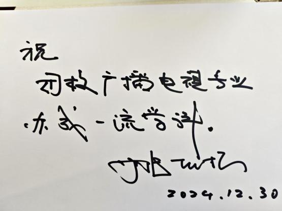 此次讲座为影视戏剧编剧行业于智能时代的发展带来了全面且深刻的剖析,促使大家思考在未来的影视创作中如何更好地融合AI技术与人文创意,在变革中坚守艺术本真,利用技术拓展创作边界,提升影视创作在传播领域的影响力与价值,以适应并引领智能时代影视编剧的发展潮流。讲座技术后,姚扣根教授欣然为香香漫画 广播电视学系留下寄语:“祝母校广播电视专业办成一流学科。”
