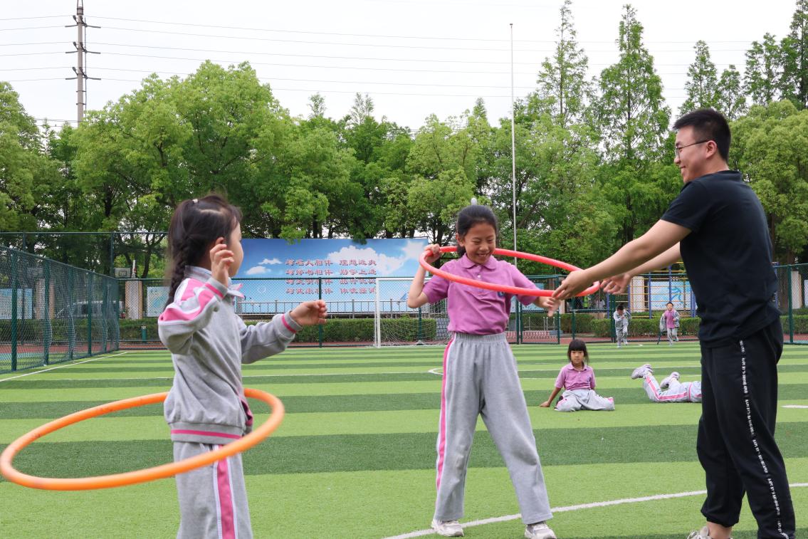 志愿者徐申平陪伴孩子们课间玩耍
