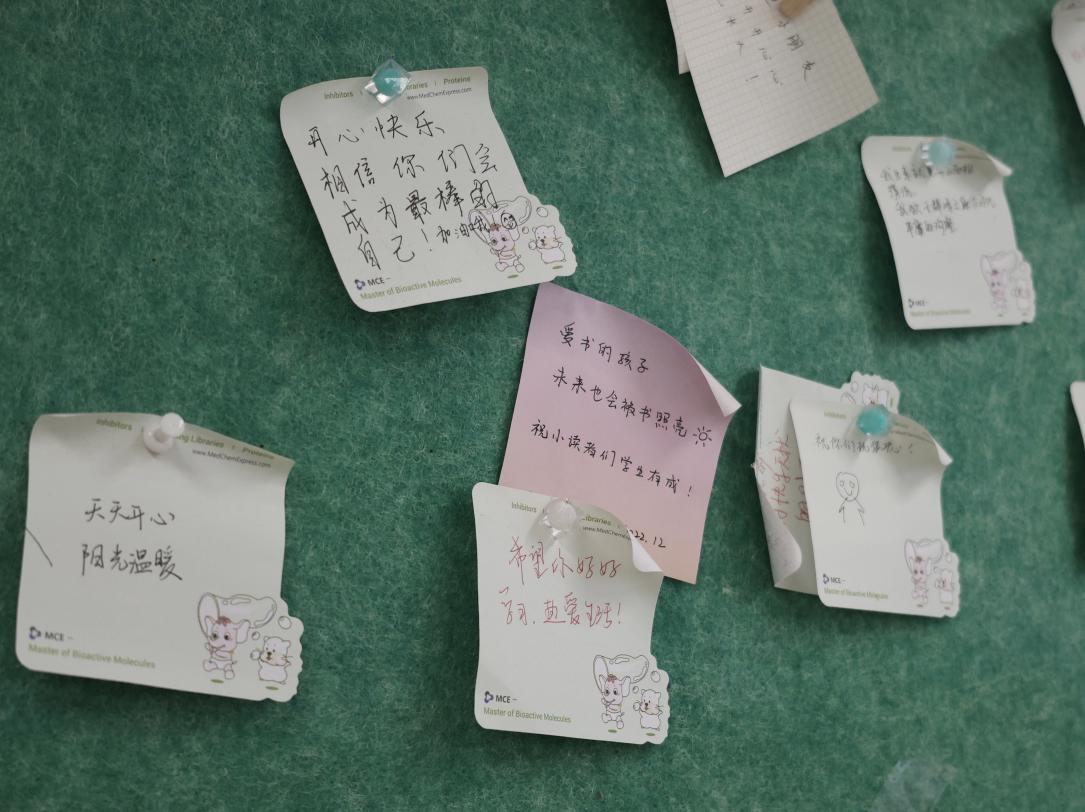 图书馆墙壁上贴满了志愿者给孩子们的寄语