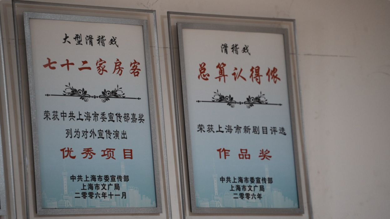 上海独脚戏传承中心墙上贴满了各个剧目的荣誉证明