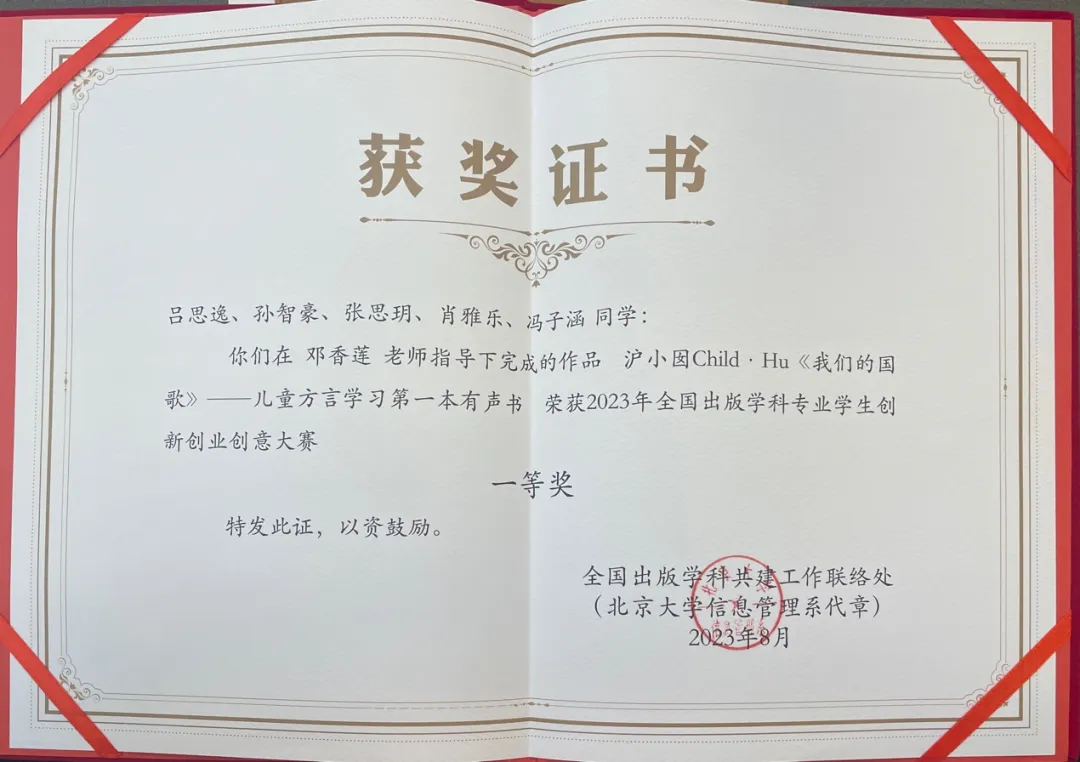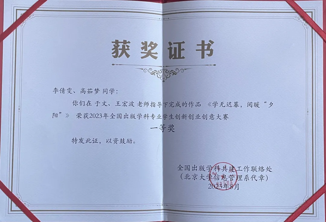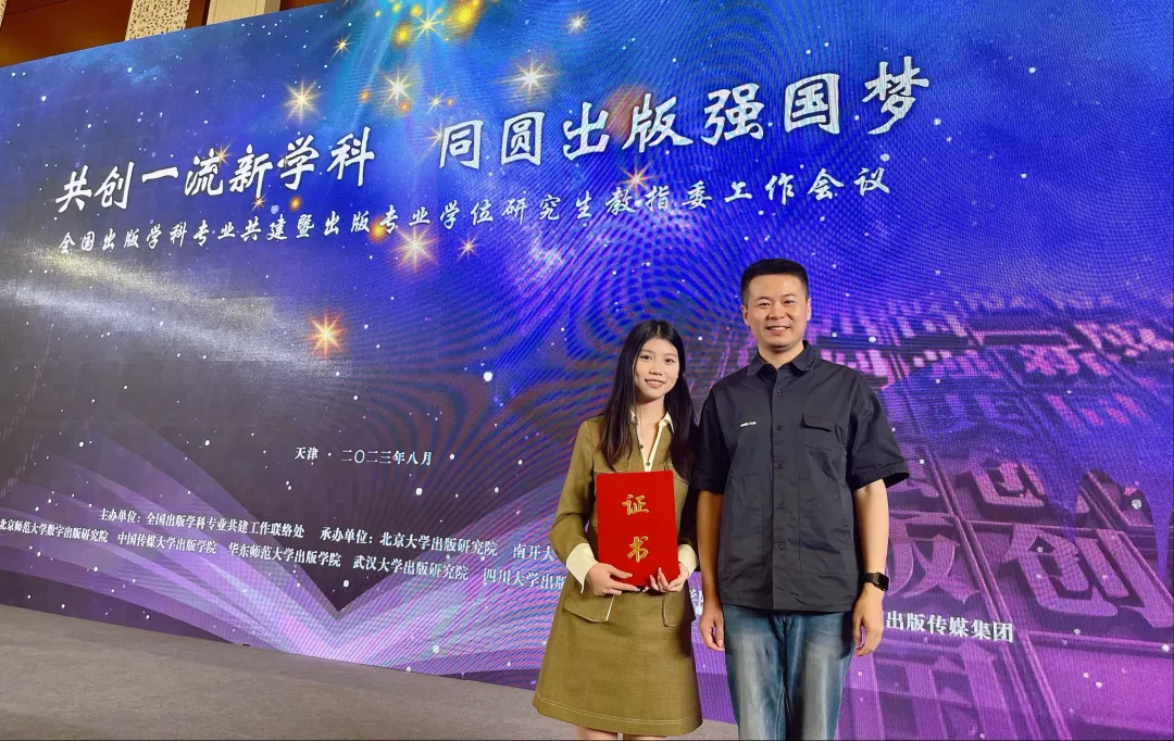 8月31日,2023年度全国出版学科专业学生创新创业创意大赛颁奖仪式在南开大学津南校区举行。国家新闻出版广电总局原副局长、中国出版协会理事长邬书林,中宣部出版局局长冯士新,中宣部版权管理局局长王志成,教育部学位管理与研究生教育司副司长徐维清,全国哲学社会科学工作办公室副主任、一级巡视员赵川东为获奖代表颁奖。出版学院研究生李倩雯团队、本科生吕思逸团队分别斩获一等奖。