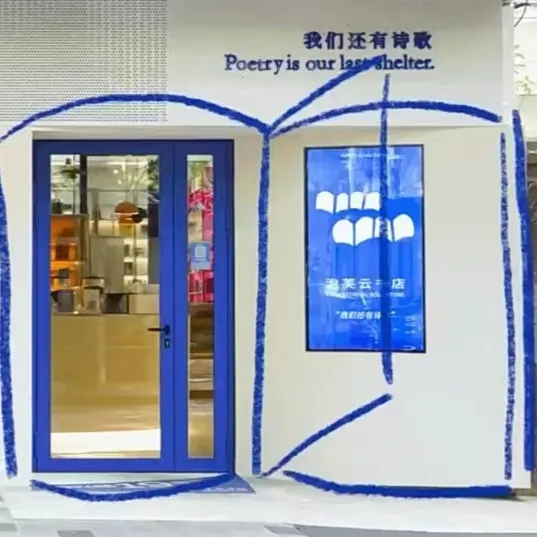 “POEMSFORYOU为你写诗”是成立于2014年的原创诗歌平台。它源于一位爱诗人的小想法,后又慢慢聚集了很多同样爱诗的朋友。他们分享、谈论诗歌,出版诗集,也尝试着把诗设计到日常所见之物上。于是,这群爱书爱诗的人在曾经的出版一条街上,开设了一家蓝色的诗歌书店——泡芙云书店。