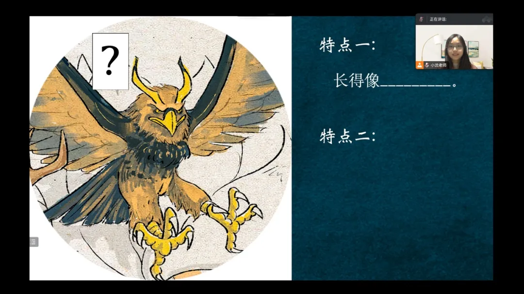 精读环节,沈老师通过请学生观察图片中奇兽的特点,引发学生的阅读兴趣,再出示书中的原文,进行详细的字词讲解与内容解释。在讲解完蛊雕、凤凰两个奇兽的故事后,沈老师带领学生探索《山海经》的语言特点,提高学生的阅读能力和文本鉴赏能力。