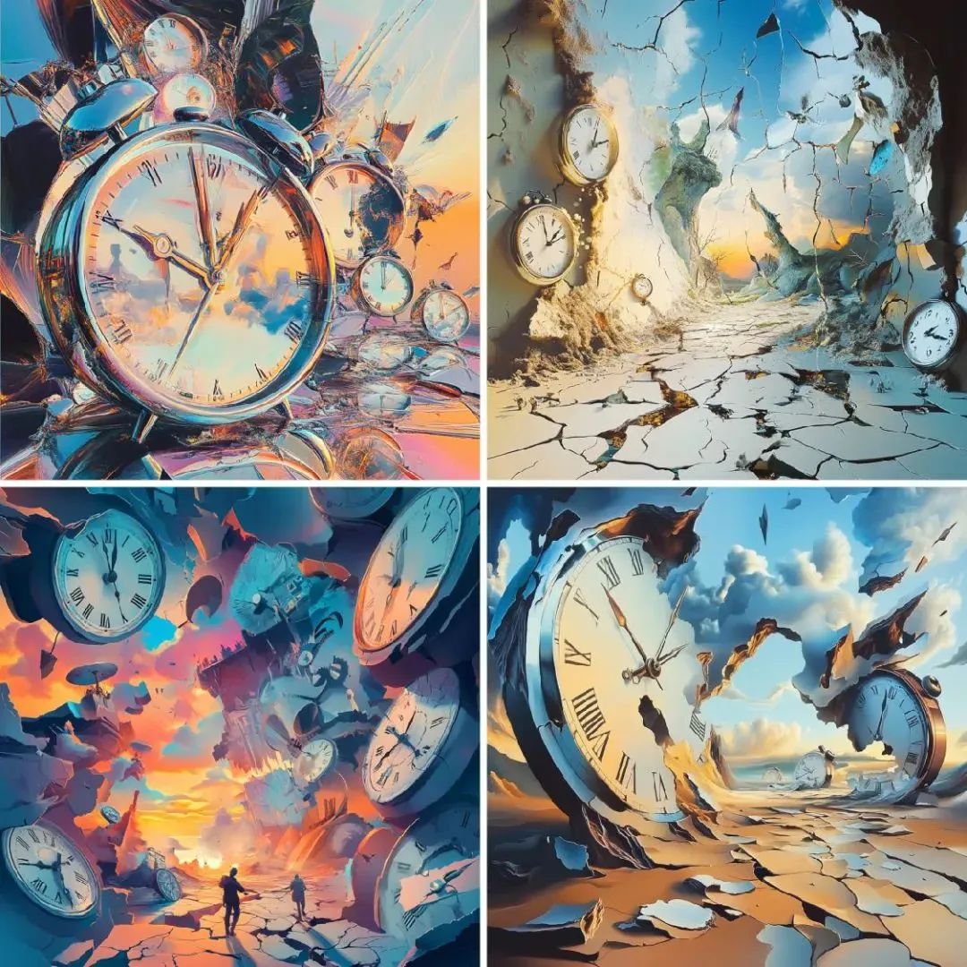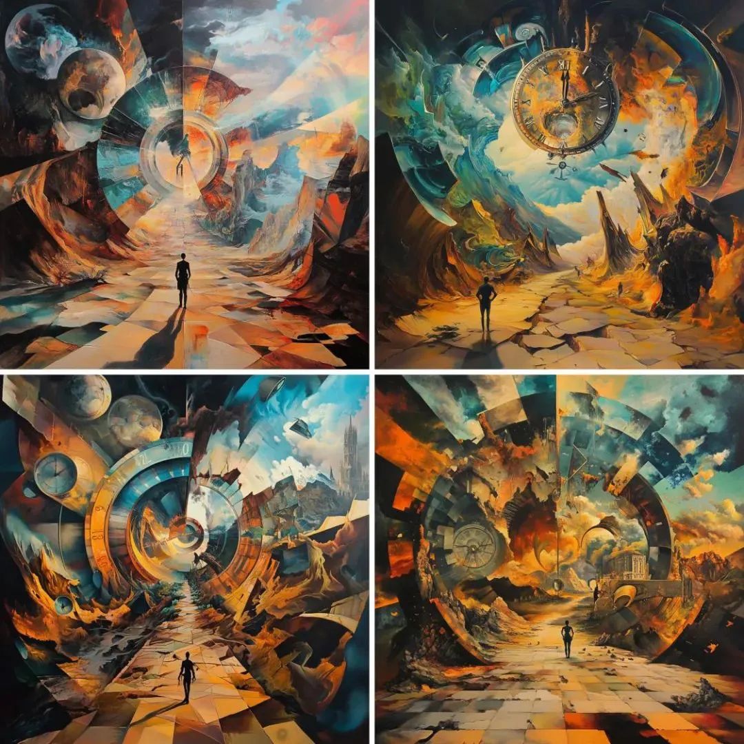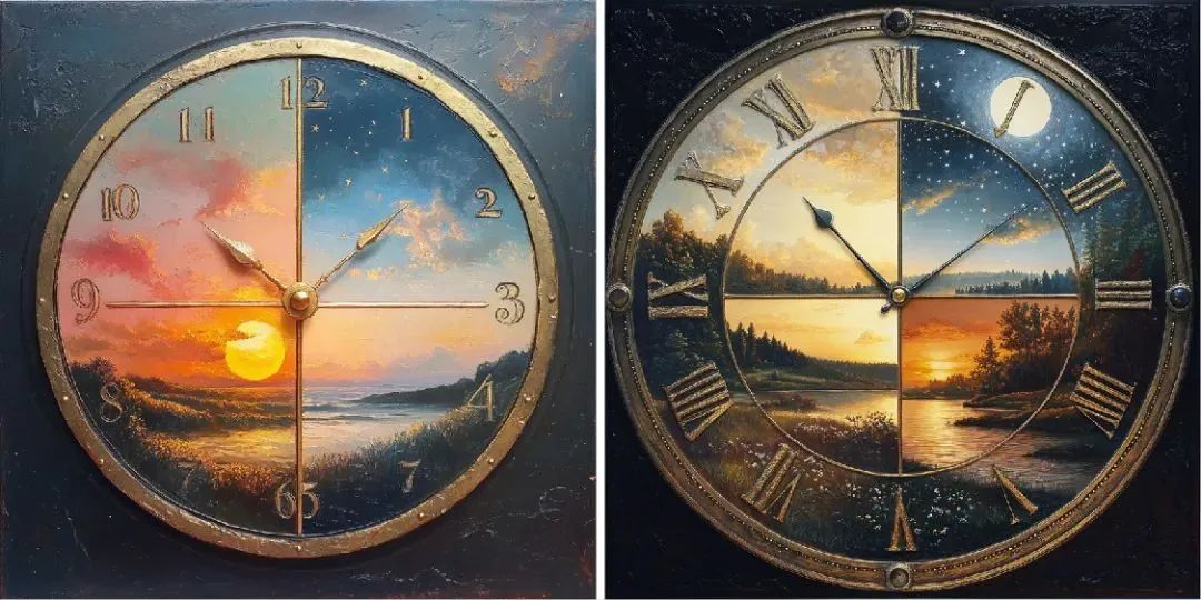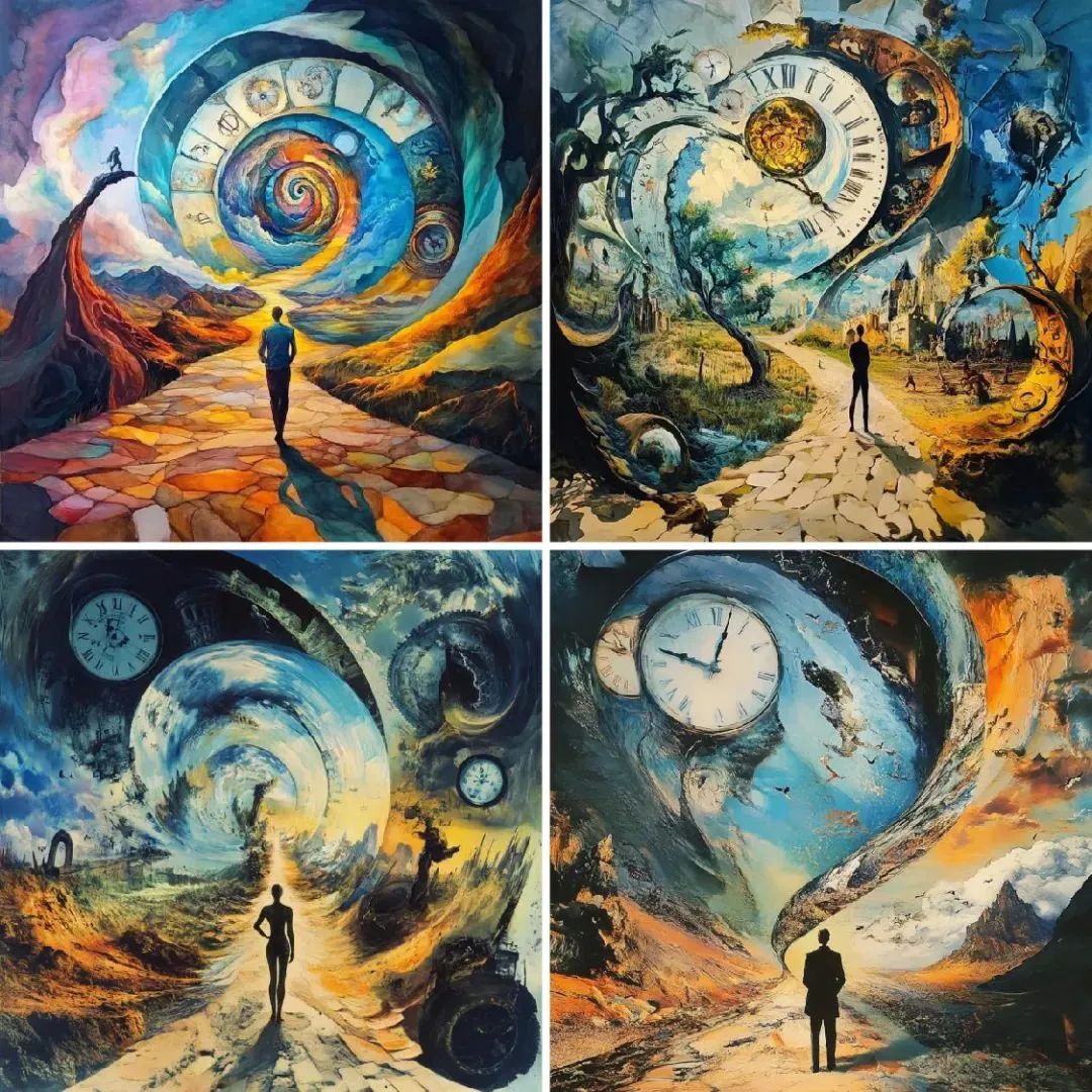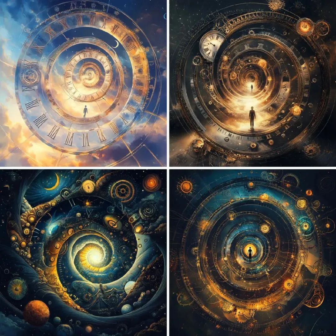 时间并不是线性发展的,而是循环往复。通过呈现周期性重复的符号,如太阳与月亮交替、四季变化等,来表达时间的循环性。超现实的画面可以把这些元素变形或错位,以表现时间在个体感知中的无穷延续。