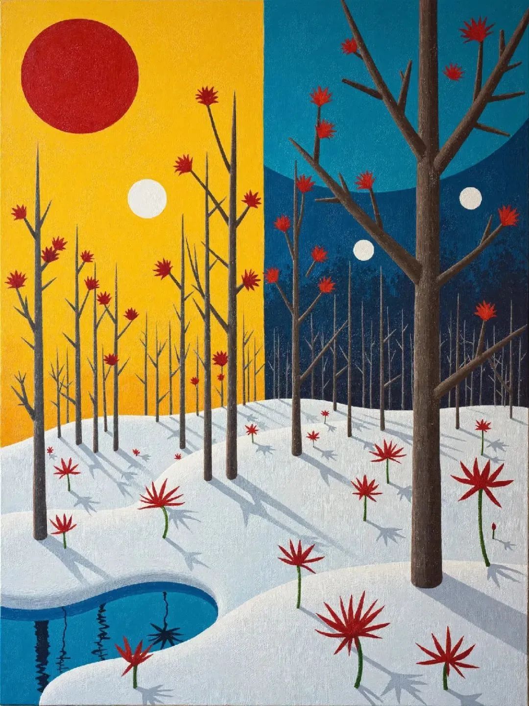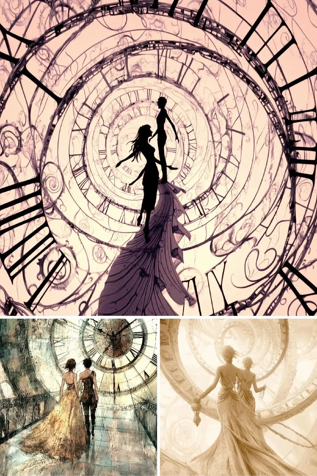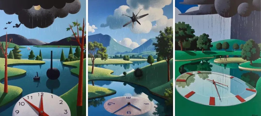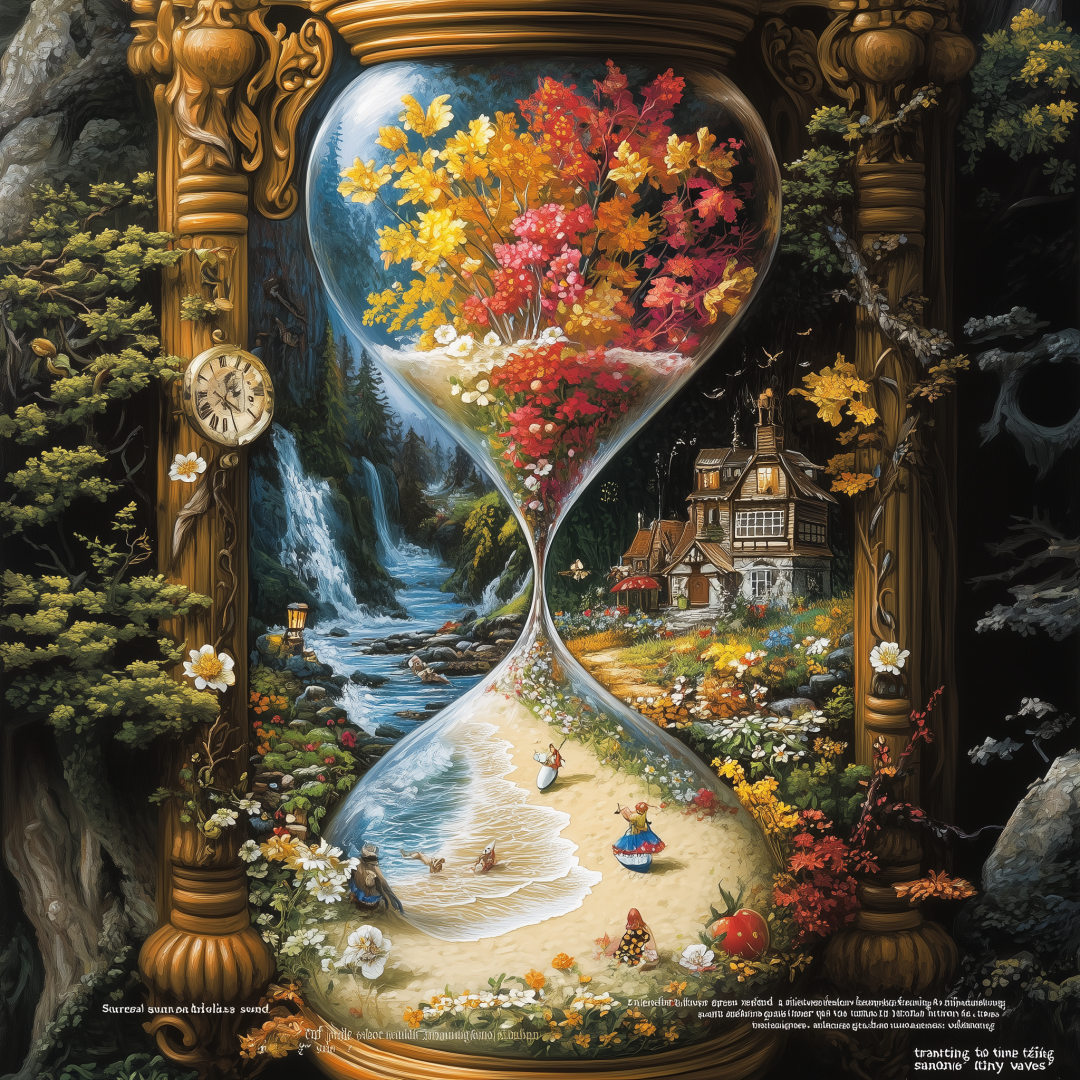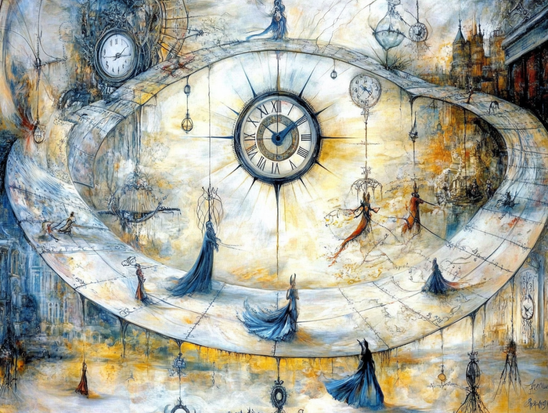 时间并不是线性发展的,而是循环往复。通过呈现周期性重复的符号,如太阳与月亮交替、四季变化等,来表达时间的循环性。超现实的画面可以把这些元素变形或错位,以表现时间在个体感知中的无穷延续。