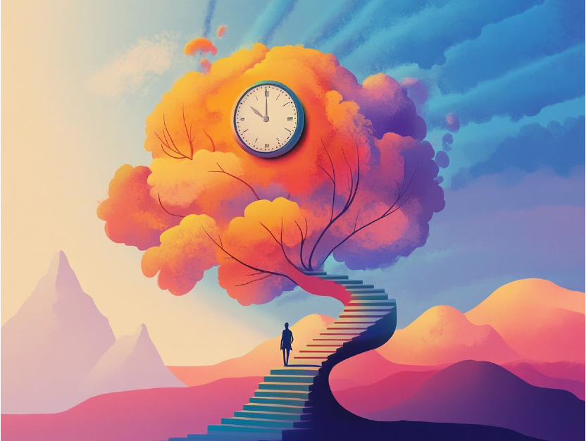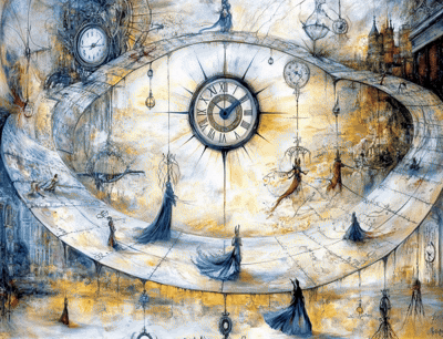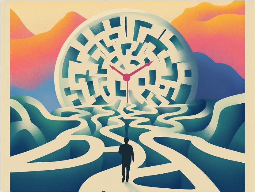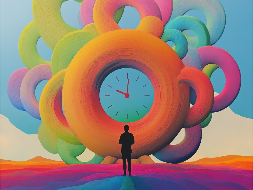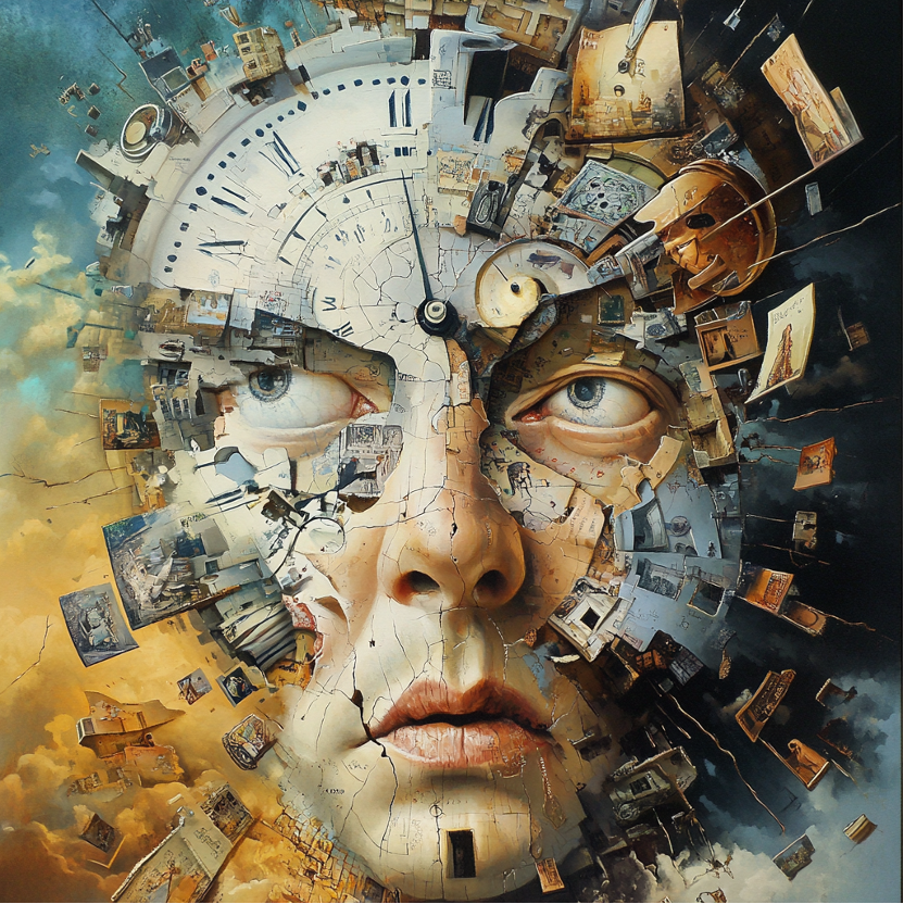 MJ / #prompt:Surrealistic abstract time perception, overlapping melting clocks, distorted figures, and fragmented landscapes. Show past, present, and future coexisting in one scene, with stretched and compressed elements, representing psychological time manipulation. Use vibrant gradients, contrasting light and shadow, and broken timepieces to evoke emotional shifts and subjective time flow