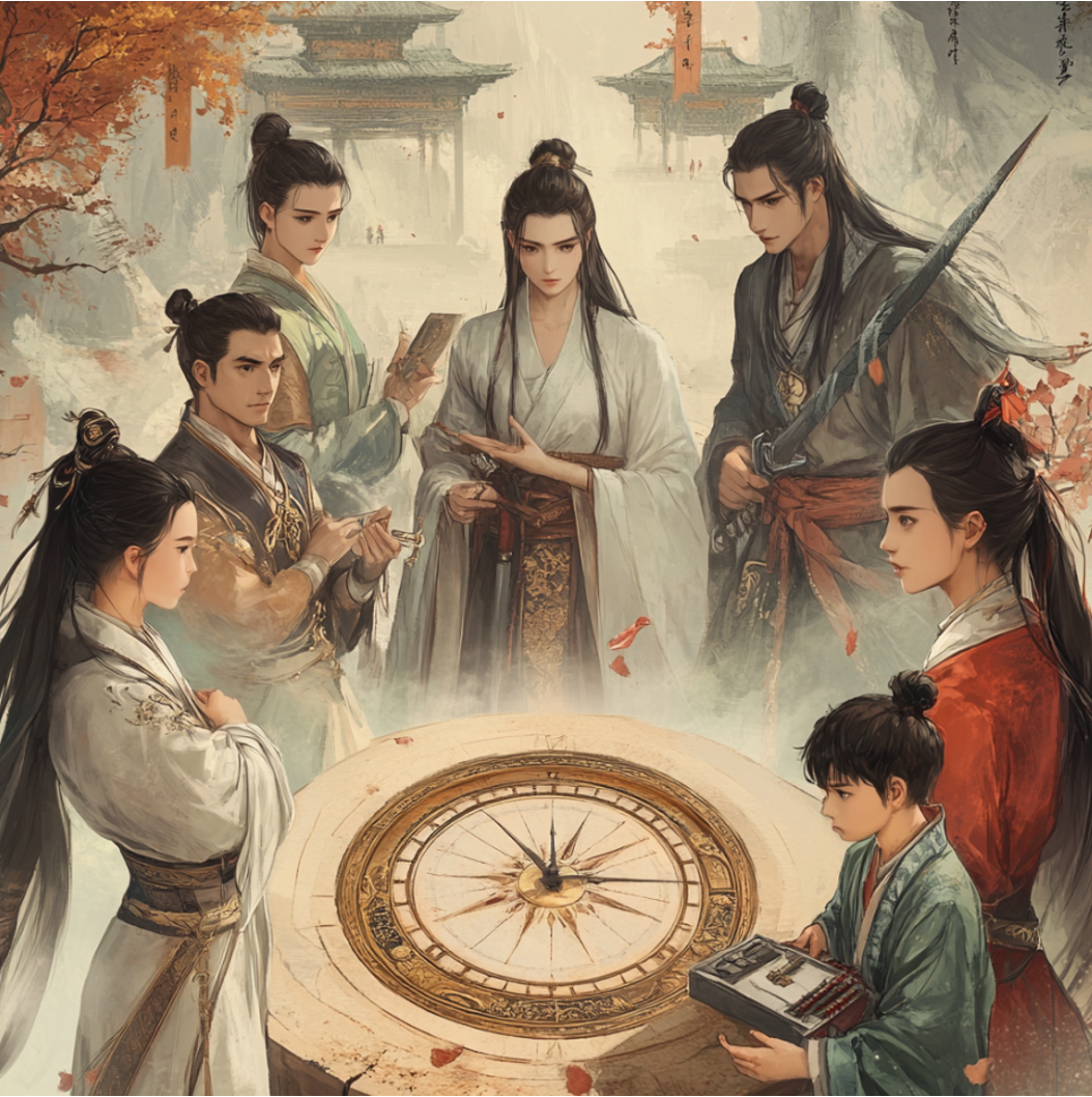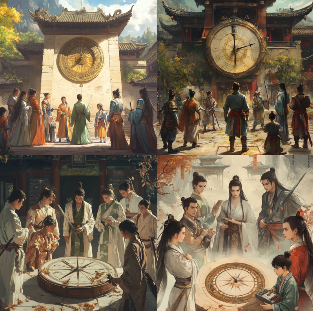 MJ / #prompt:Chinese ancient realistic style; The sundial is in the center of the screen, surrounded by several young and handsome swordsmen and female knights, as well as a child carrying a medical kit, anxiously looking at the sundial as if waiting for something;