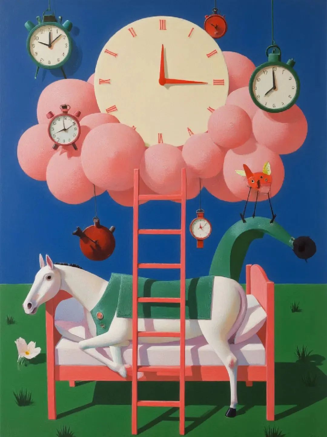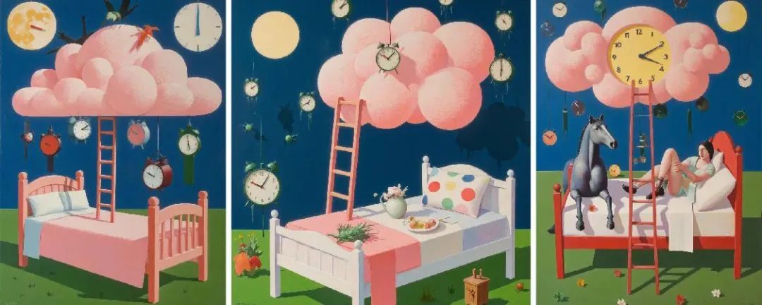 Liblib AI / #prompt:chaoxianshi,surrealism, pinkcloud, abed and a pink cotton are connected by a wooden ladder inbetween,ladder, bedin grassyfield,darkblue sky, There is a very big bright moon in thesky, insidethe moon is a clock dial, There are many clocks in the picture, round, square, triangular, some clocks hanging from theclouds, ahorse is on the bed, and the pointer of the clock point to ten o'clock in the evening,