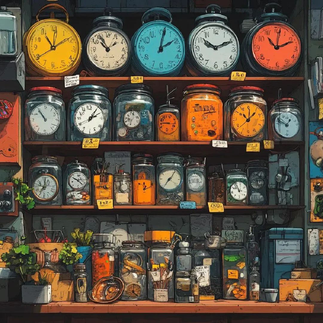 MJ / #prompt:A time convenience store, comic style, jars shaped like clocks, various items in the shape of time symbols such as hourglasses, sundials, and watches, warm and whimsical atmosphere, vibrant colors, detailed line art, imaginative and surreal design