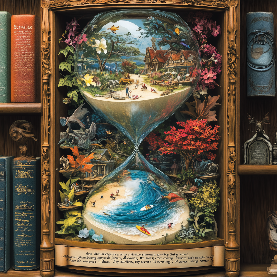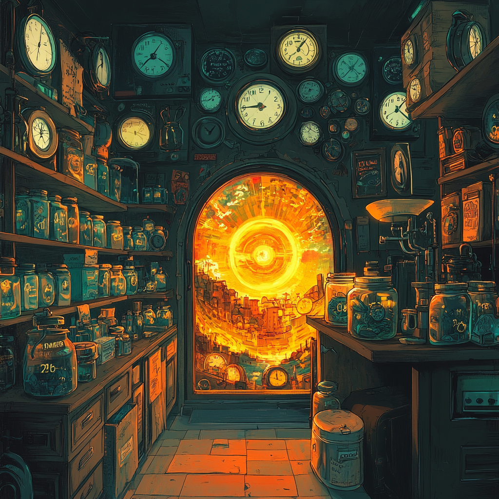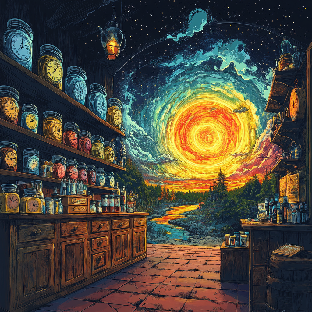 MJ / #prompt:A time convenience store, comic style, jars shaped like clocks neatly arranged on shelves, various items in the shape of time symbols such as hourglasses, sundials, and pocket watches, a mysterious glowing time portal in the background with a distorted, swirling landscape visible through it, warm and whimsical atmosphere, vibrant colors, intricate line art, surreal and imaginative design