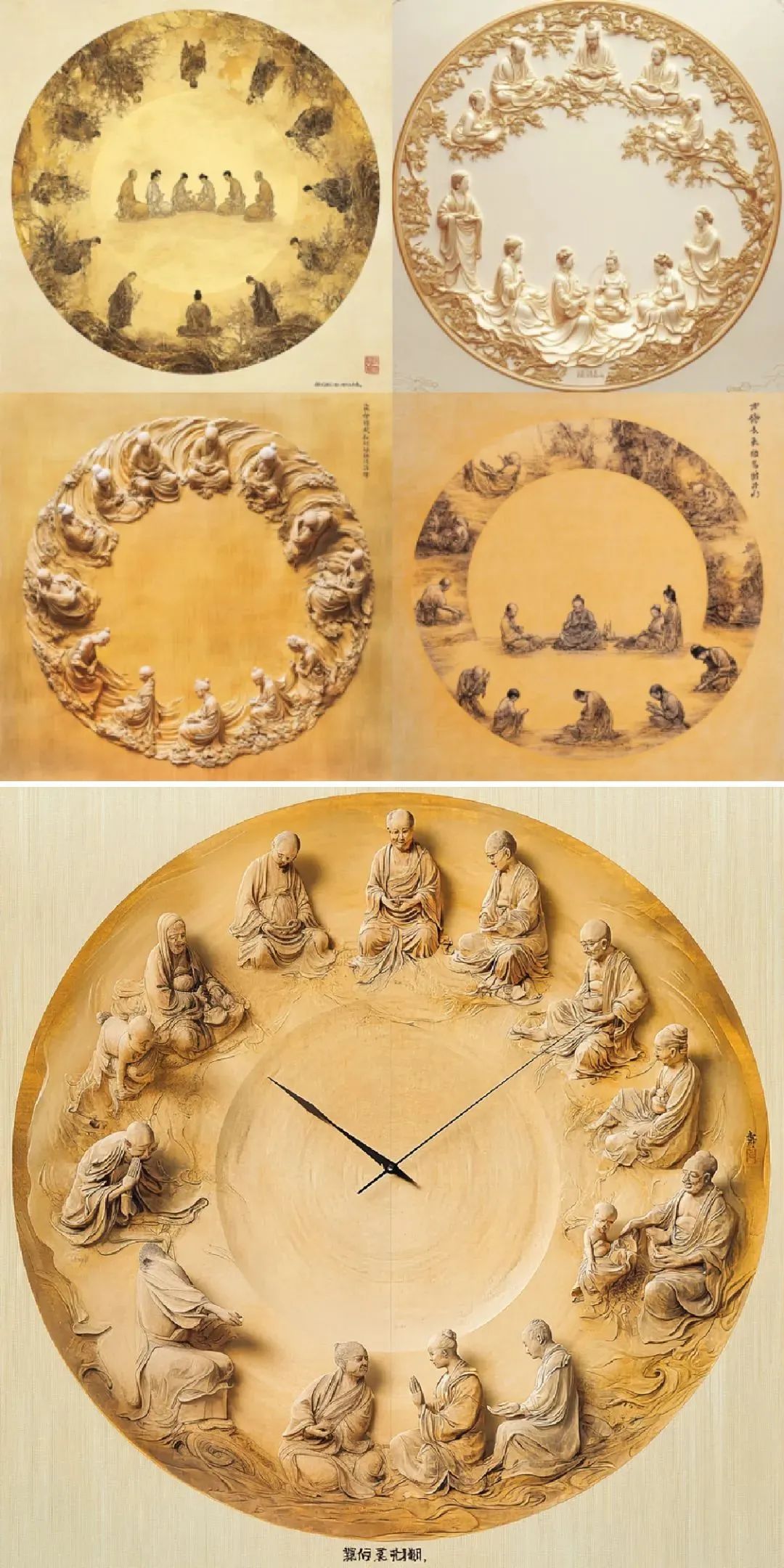 MJ / #prompt:A detailed clock face with clear, elegant numerical markings around the edges, its surface divided into four quadrants depicting the same natural scene across different times of the day. The top-left quadrant shows a serene dawn with soft pink and gold hues, the top-right depicts a bright noon with vibrant blue skies, the bottom-right illustrates a warm sunset with orange and red tones, and the bottom-left captures a tranquil midnight with deep navy blues and stars. The bas-relief style adds depth to the textured scenes, while the metallic rim of the clock glows subtly under diffused lighting. Created Using: neoclassical design aesthetics, multi-depth carving, soft gradient blending, fine details, hd quality, precise transitions, time-inspired symmetry –ar 1:1 –v 6.0