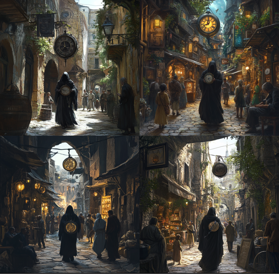 MJ / #prompt:Dark sci-fi style; In the middle of the screen, there is a time messenger dressed in a black robe holding a clock and walking through a small alley. On both sides of the alley, people of different ages are doing their own activities.-- ar 1:1